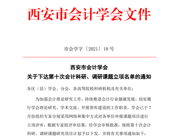 8月3日,西安市会计学会《西安市会计学会关于下达第十次会计科研、调研课题立项名单的通知》(市会学字〔2021〕19 号)公布了第十次会计科研、调研课题研究项目立项结果,全市计划立项27项,公司获批5项。