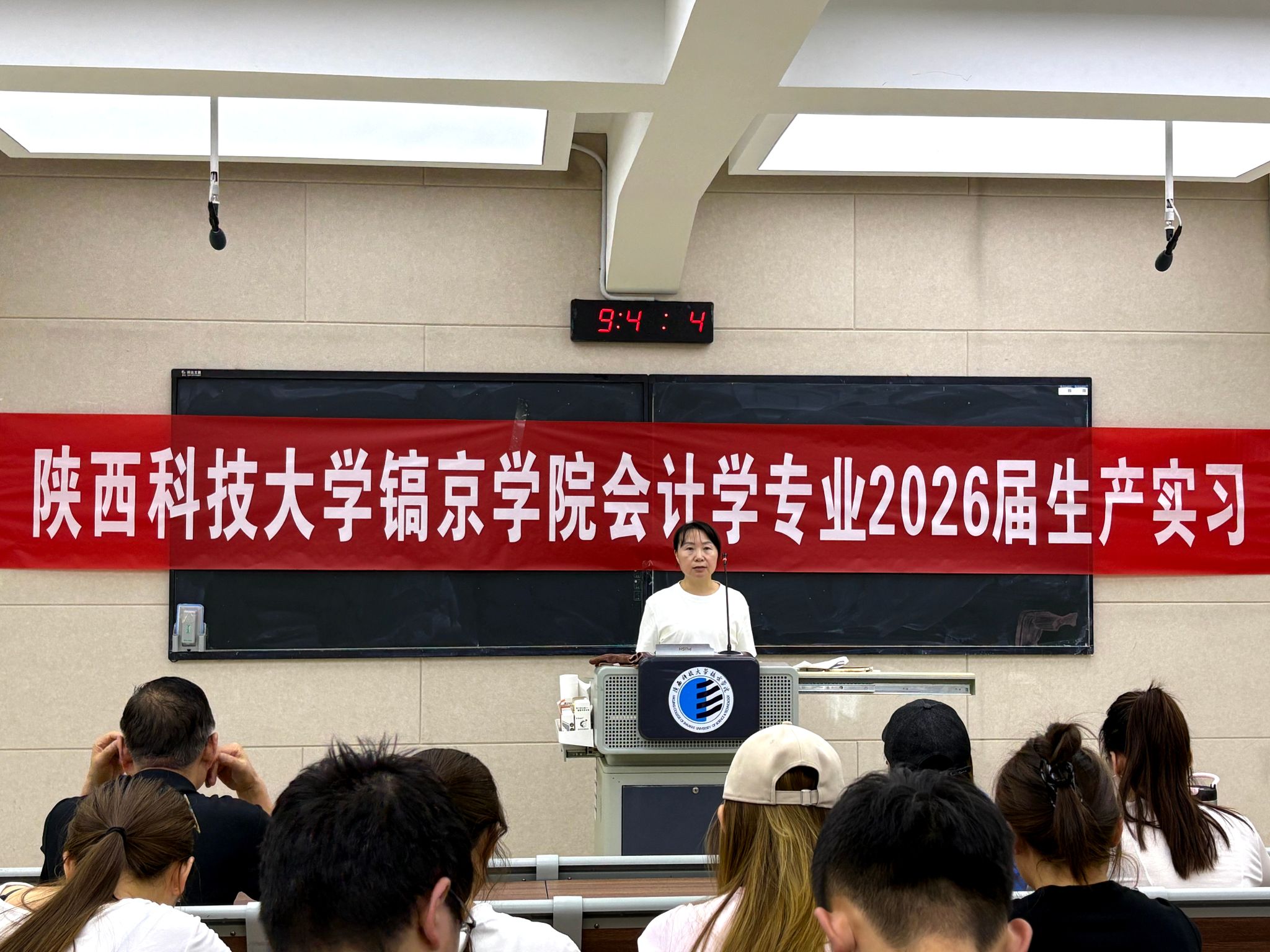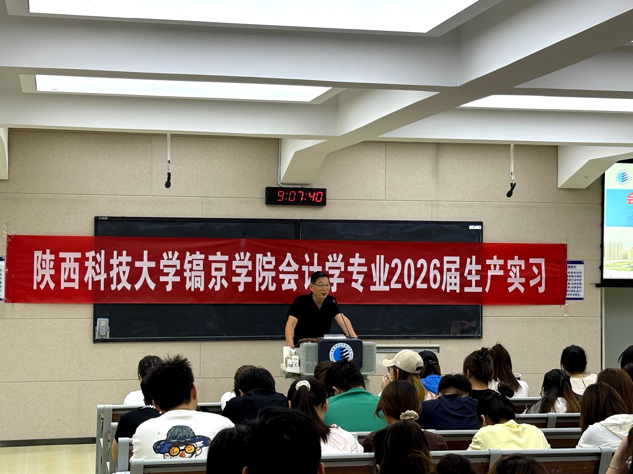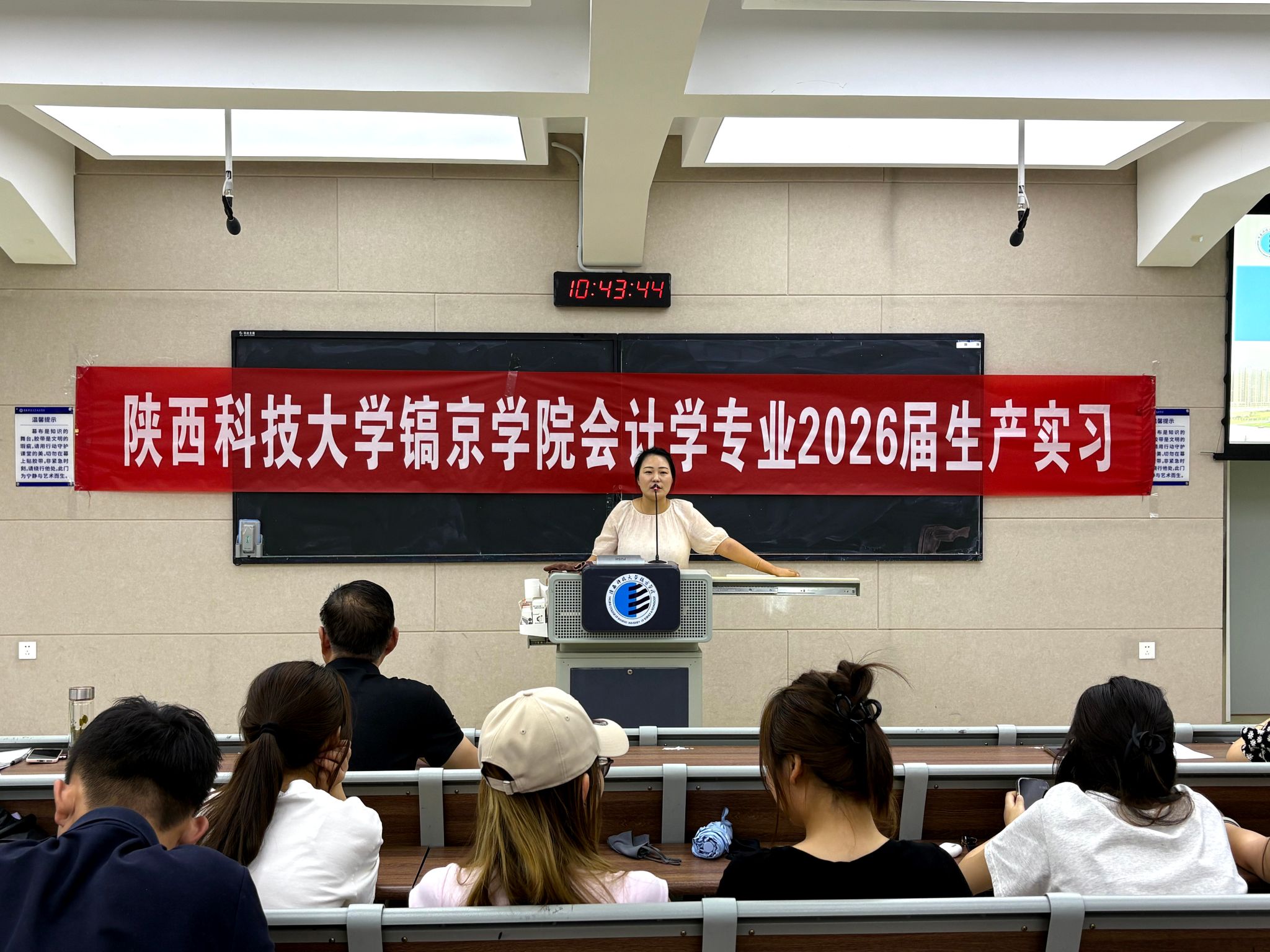 6月17日,会计学专业2026届生产实习启动仪式在教学楼320教室举行。会计2206班、会计专升本2403班全体同学参加会议,会计专业带头人杨君岐教授,会计系主任姚叶叶,教研室主任蒋珩敏等教师共同出席,与企业代表西安领航财务管理有限公司经理张小莉齐聚一堂,共同开启实践育人的崭新征程,会议由教研室主任王文豪主持。
