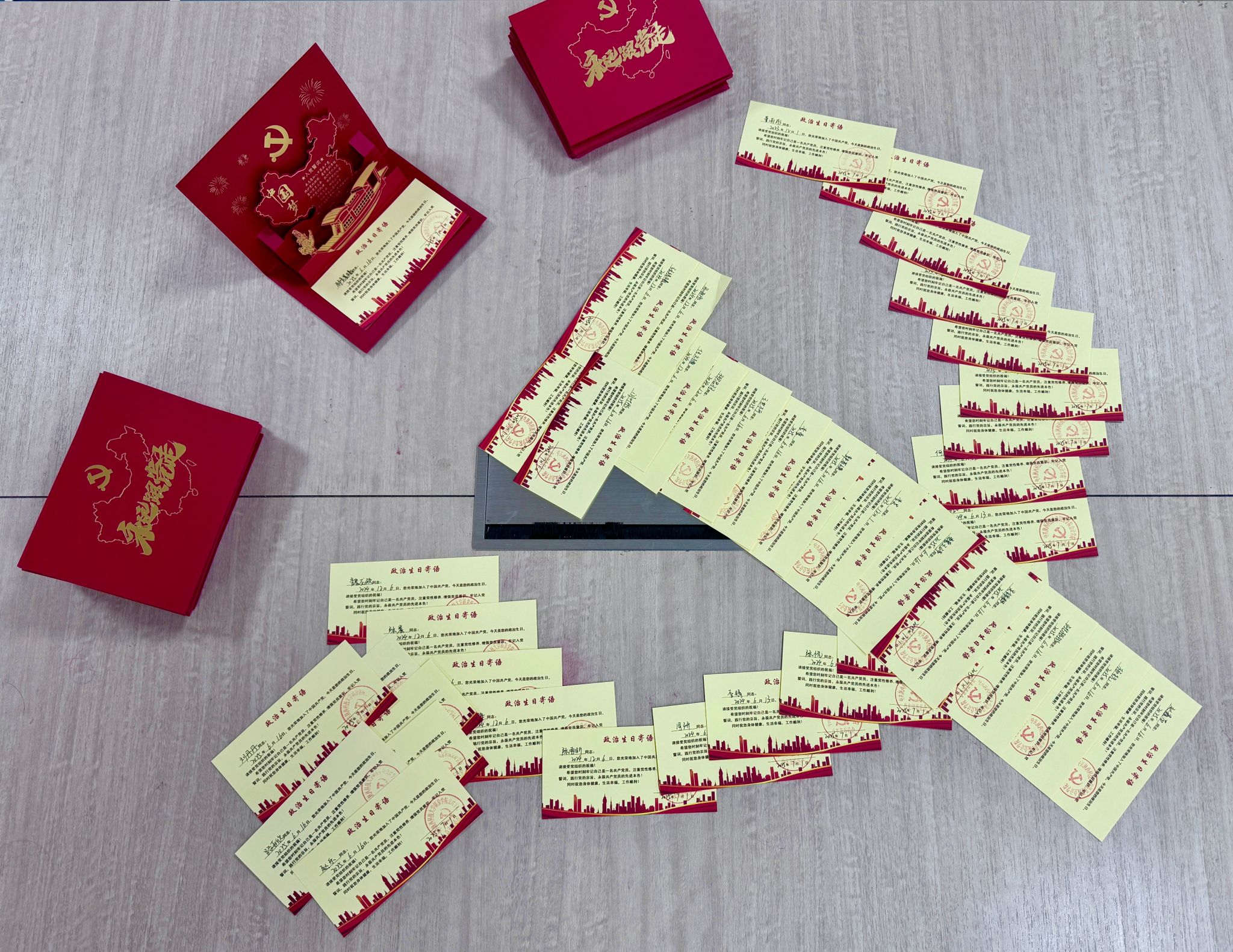 政治生日贺卡递,组织关怀润心田。本次活动的核心环节是为员工党员过集体“政治生日”。必发集团第一、第二、第三员工党支部书记薛晓轩、刘允绚、鲁婕同志郑重为各支部员工党员代表颁发精心定制的“政治生日贺卡”,贺卡内清晰印有党员的入党日期和姓名,饱含着党组织对员工党员的殷切期望与深切关怀。这份特殊的礼物,不仅承载着诚挚祝福,更是一份沉甸甸的政治责任提醒,时刻激励党员铭记身份、践行宗旨。