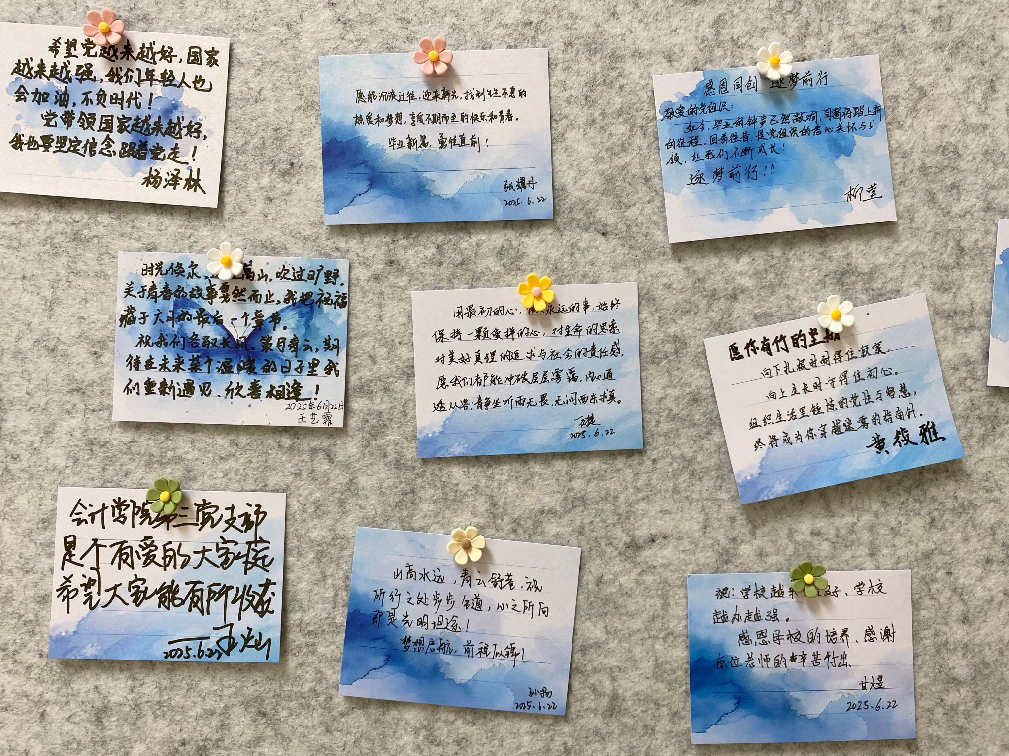 为留存弥足珍贵的党员情谊,本次活动特别开设“寄语传情”互动环节。毕业生党员们将对党组织的感恩眷恋、对同窗的暖心祝福、对未来的壮志豪情倾注于笔尖。一句句饱含赤诚的心声跃然卡片之上,在纪念墙上展示承载着青春温度的文字,不仅为热血年华烙印下坚定的信仰坐标,更以集体记忆的形式,为党组织留存下一段关于初心与传承的鲜活注脚。