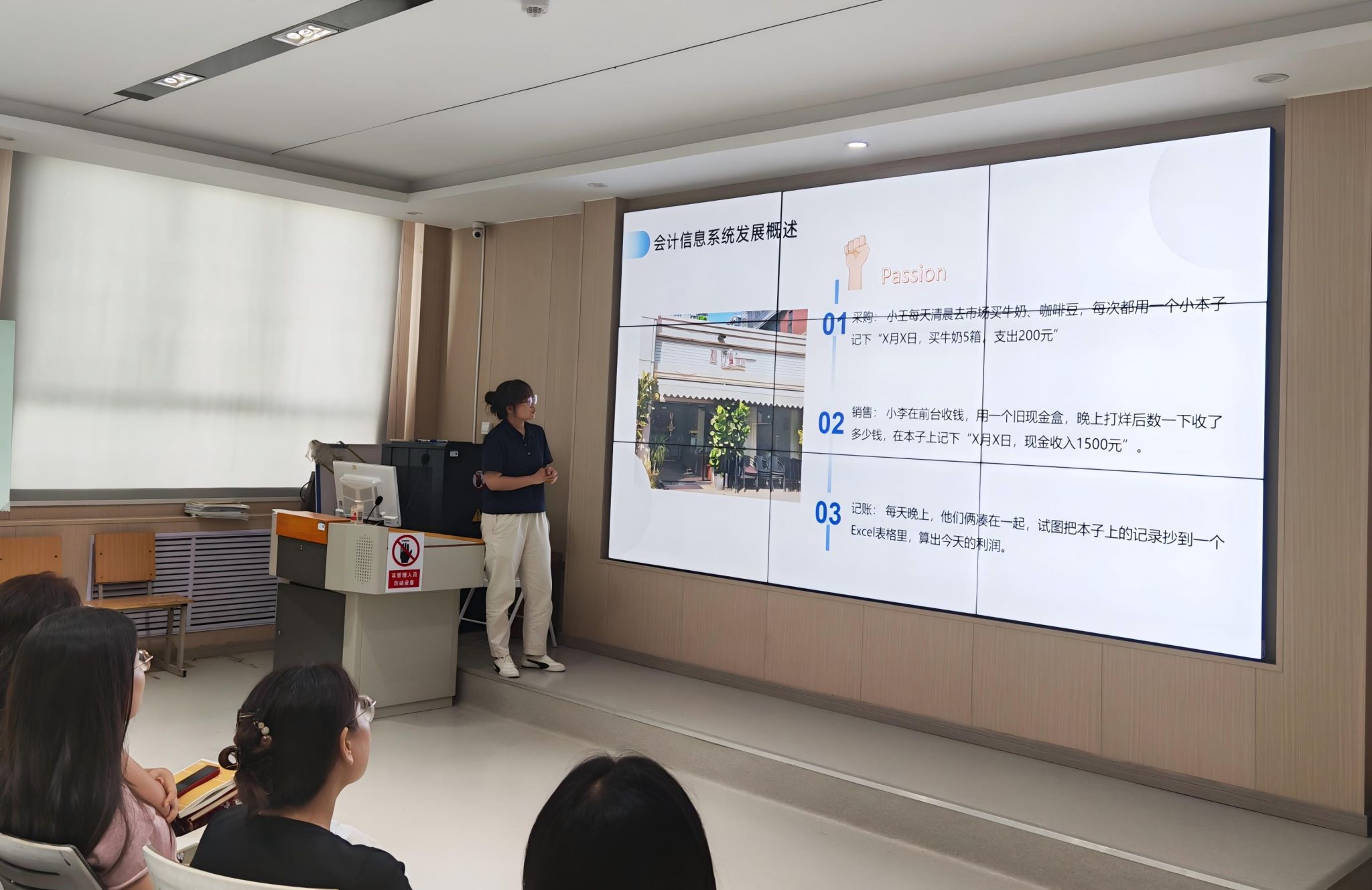 随后,三位新晋教师李燕昭、谭丽娜、解春玉分别就新学期承担的《税收学》《信息技术与会计信息化》、《会计职业道德》课程进行了说课展示。李燕昭老师介绍了《税收学》课程,从日常生活中的常见税种入手,引导员工理解税收的重要性。她准备充分、表达清晰,展现了年轻教师的教学活力与创新意识。谭丽娜老师承担的《信息技术与会计信息化》课程,介绍了会计信息系统的发展历程。她表示:“会计软件经历了电算化、信息化,来到了智能化的时代。技术的进步不仅加快了会计核算的速度,还使业务分工更精细,业务流程更标准。”