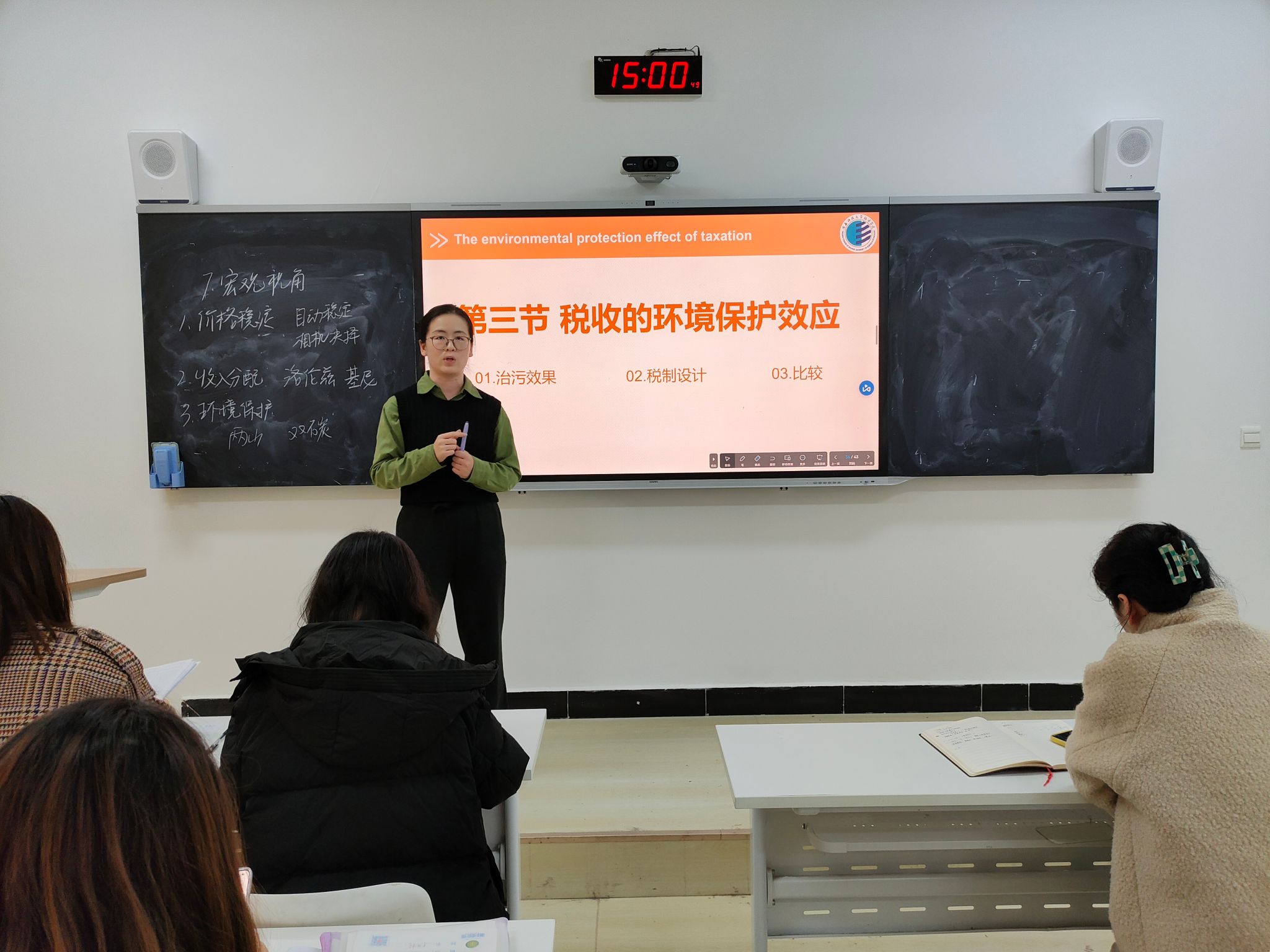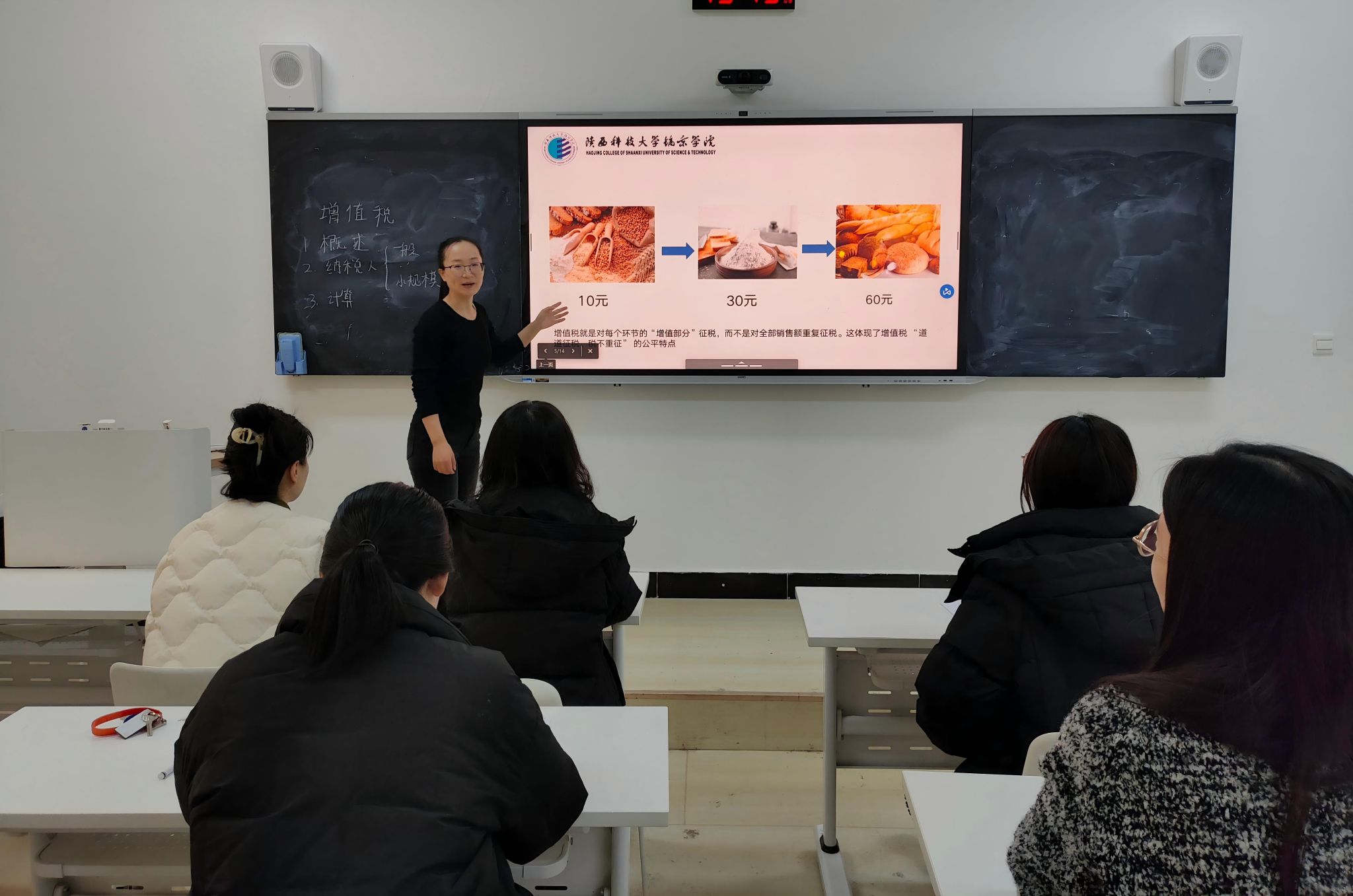 宇文可征老师通过生动有趣案例与逻辑推导相结合,将抽象理论具象化,引导听众深入理解税收法律制度的概念;陈庆哲老师围绕 “假设检验” 主题,结合教研实践,分享了对课堂优化与质量提升的思考;谭丽娜老师以手工账务处理流程为切入点,通过流程图解析,清晰呈现账务处理的全环节逻辑。解春玉老师以 “小麦 - 面粉 - 面包” 的产业链为例,生动阐释增值税的计税原理,让税收知识变得通俗易懂;李燕昭老师聚焦 “税收的环境保护效应”,从治污效果、税制设计、政策比较三个维度,剖析税收在环保领域的作用机制。