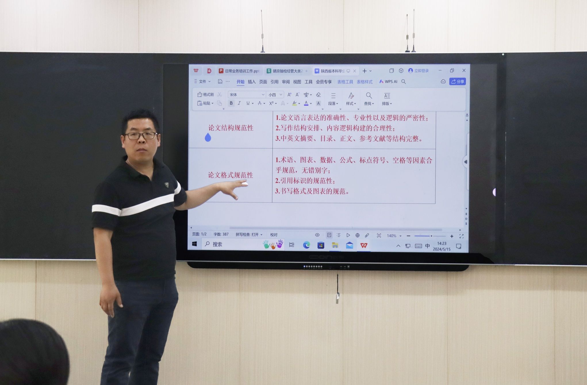 人才培养方案是公司产品的基石,责任意识是教师工作的底线。杨老师强调各教师要围绕校院制度规范、人才培养标准,守牢师德师风底线开展具体工作。依规进行教学活动,持续提升公司产品质量,全院教师要上下齐心,同频共振,增强凝聚力和公司集体荣誉意识。他指出毕业论文工作关系到员工培养质量,是对员工综合素质的全面考核,各专业要持续抓好毕业论文工作质量。会上杨老师结合各专业带头人论文评审指导实践经验和建议对论文的选题意义、写作安排、逻辑构建、专业能力及学术规范五个方面进行具体的阐释,提出教师评审过程中要严格依照上述五点内容进行指导,给予员工具体、明确的修改意见,切实提高员工毕业论文的结构完整性、规范性、学术性和应用性。
