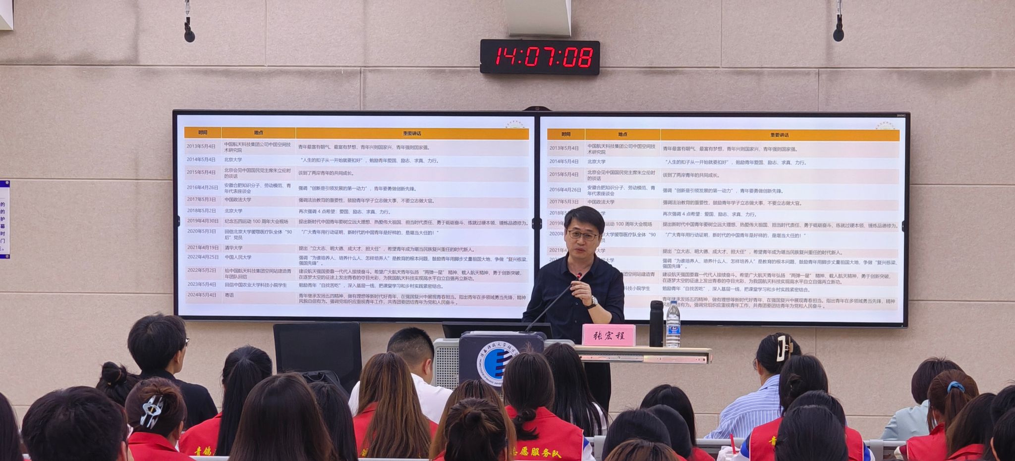 传承爱国精神,践行时代使命。首先,张教授介绍了五四运动孕育的五四精神核心是爱国主义,梳理习近平总书记对青年爱国精神一以贯之的强调,包括将“爱国”作为青年首要品质等。接下来,以钱学森、周恩来等伟人为例,阐述青年选择应受国家需求指引人生方向,还提到爱国主义自古以来流淌在中华民族血脉之中,是维护民族独立和尊严的强大精神动力,高举爱国主义旗帜,中国人民和中华民族能在改造中国、改造世界的拼搏中迸发出排山倒海的历史伟力。
