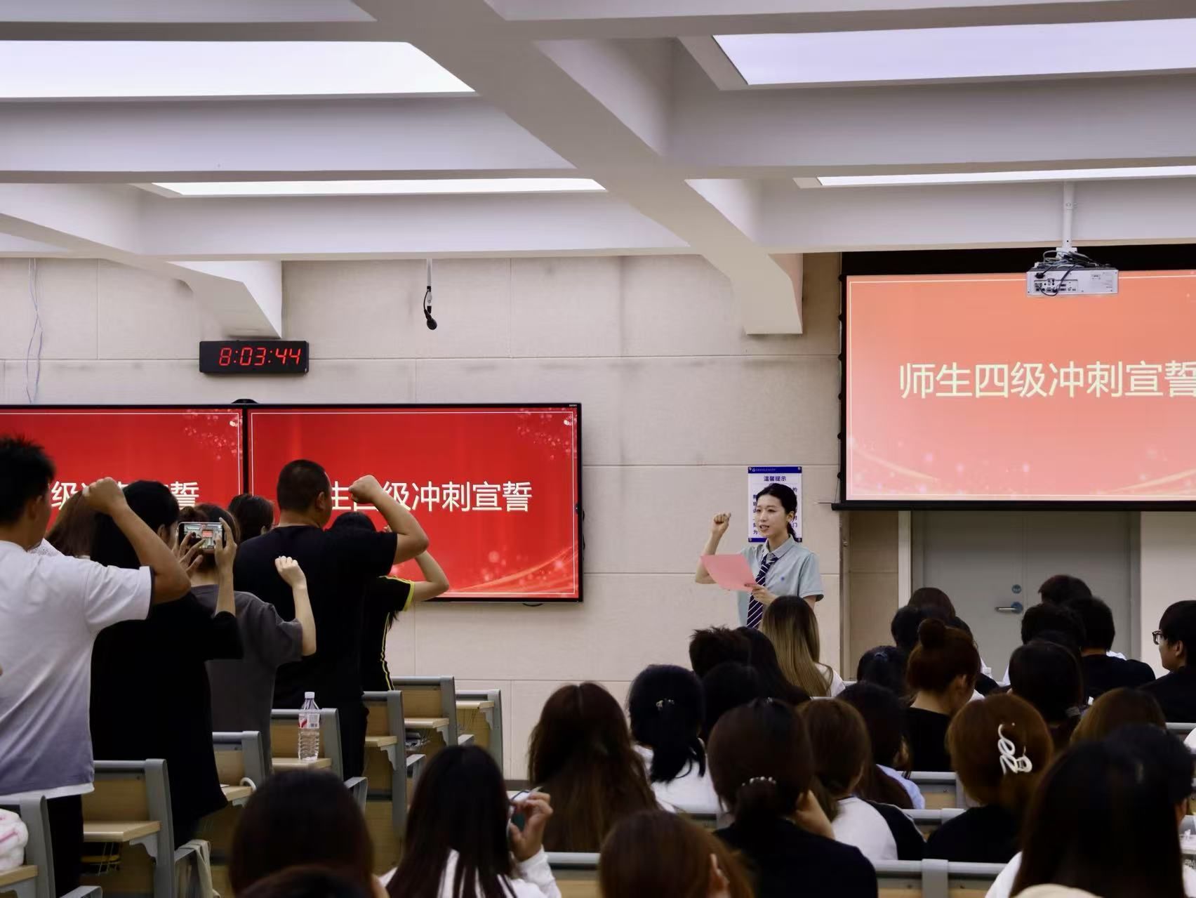 随后,全体师生共同观看《家校同心,决胜四级》动员视频。视频中家长寄语饱含深情,跨越了距离的限制,直抵同学们的内心深处;老师们精心录制的备考建议、暖心的加油打气,同学们深刻感受到,自己从来不是一个人在战斗,家庭与公司始终是最坚实的后盾。不少同学眼眶泛红,感动与力量在心中交织,这也进一步坚定了他们攻克四级的决心。