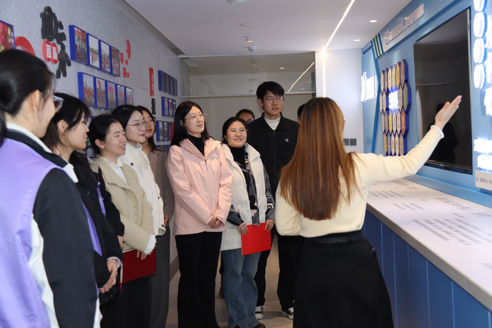 座谈后,在集团负责人的带领下,师生团队开启了企业参观之旅。大家先后走访了企业办公区、业务展厅等区域,负责人结合展厅内的发展历程墙、项目成果展,详细介绍了兴恒集团的发展脉络,从2014年初创的小型公司,逐步拓展为涵盖供应链、运输、网络科技等业务的集团化企业,以及在金融服务领域的核心优势与行业布局。真实的职场场景、清晰的业务链条、浓厚的企业文化,让师生们对企业岗位的工作内容有了更具象的认知,也为后续实习对接奠定了实践认知基础。