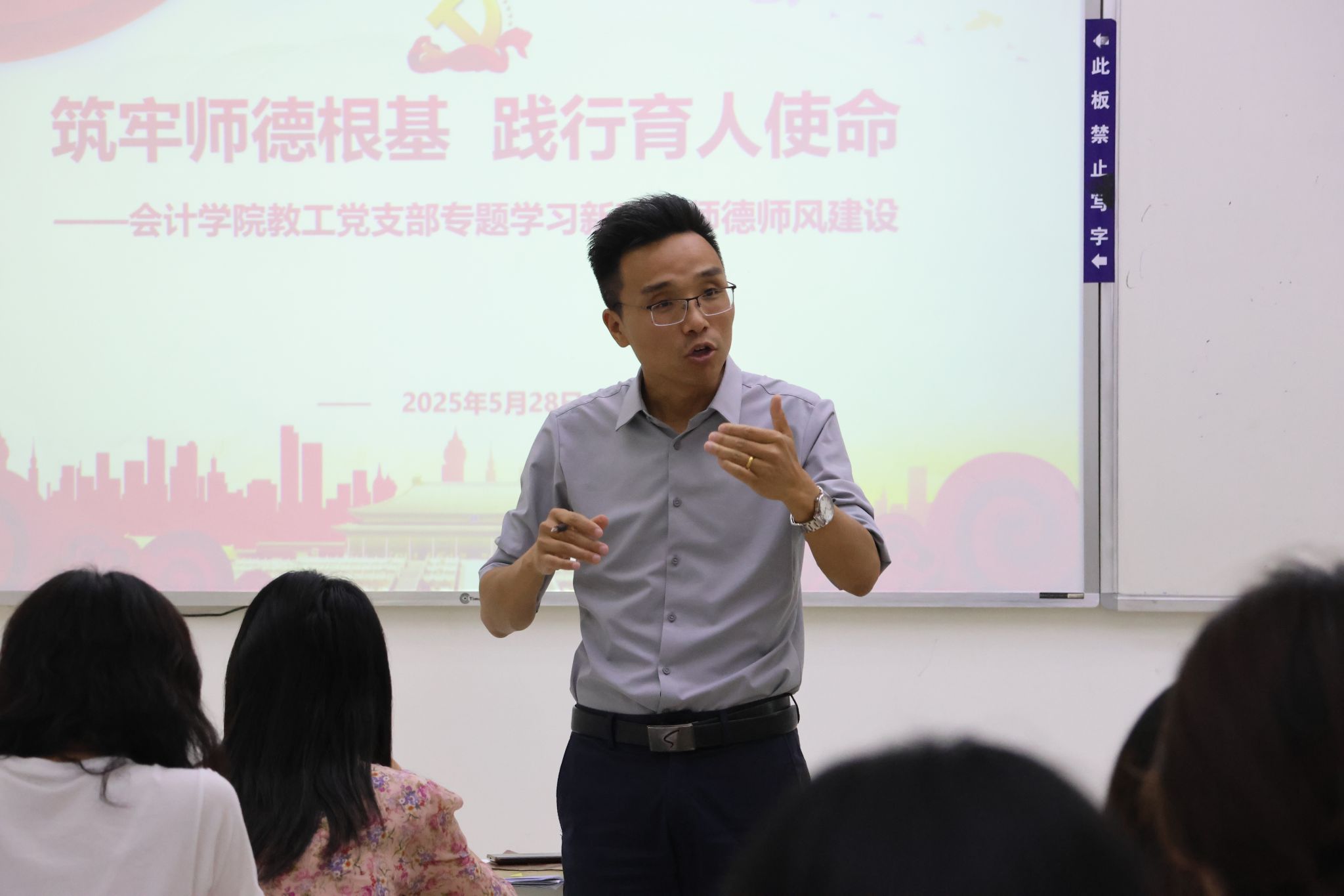 公司党总支书记赵卓同志在总结中强调:“师德是教育之魂,教师党员要率先垂范,以‘四有’好老师标准严格要求自己,将师德规范内化于心、外化于行,为培养德才兼备的会计人才贡献力量。”