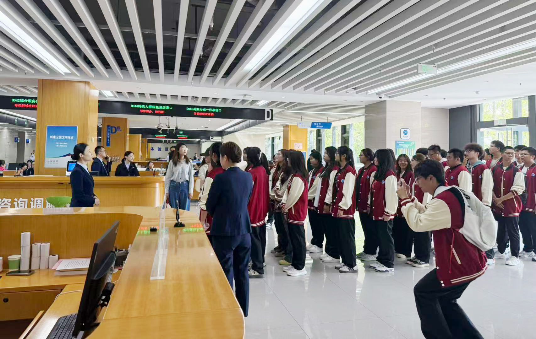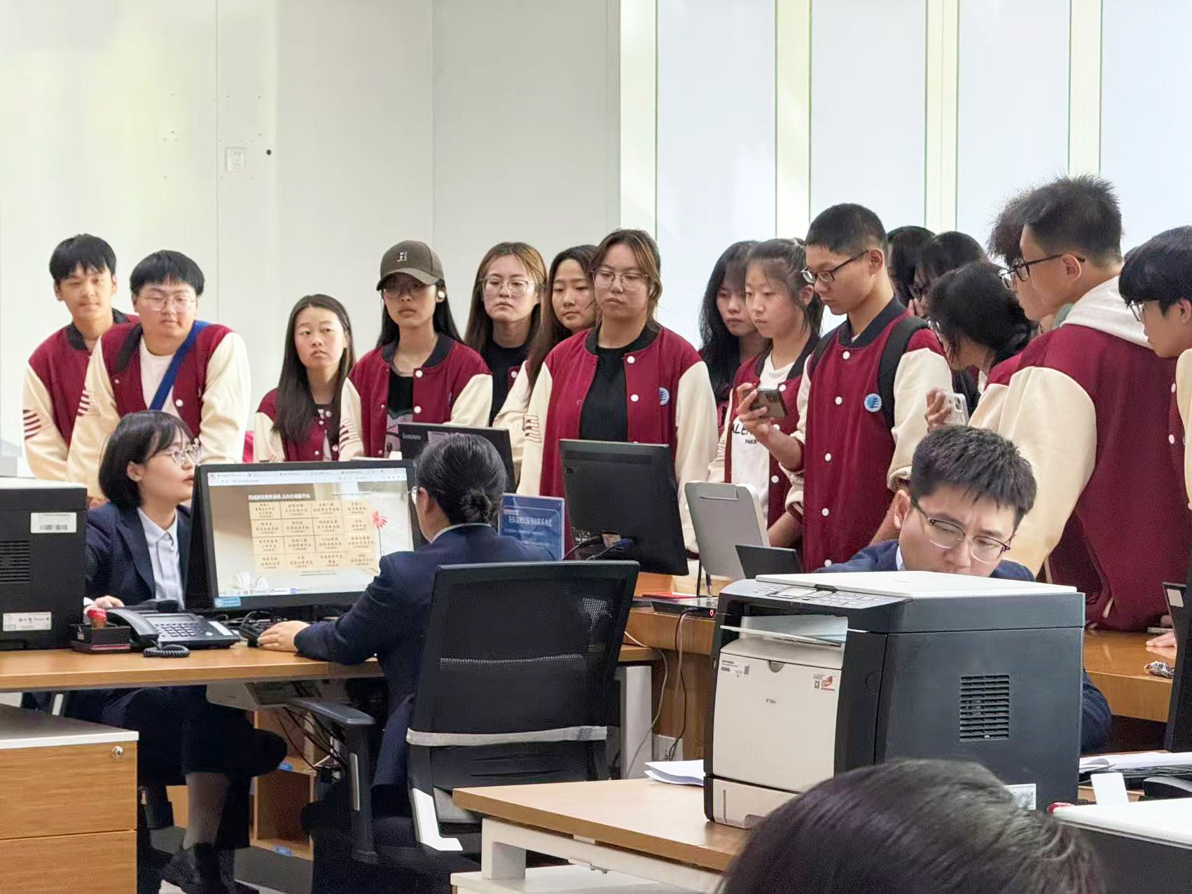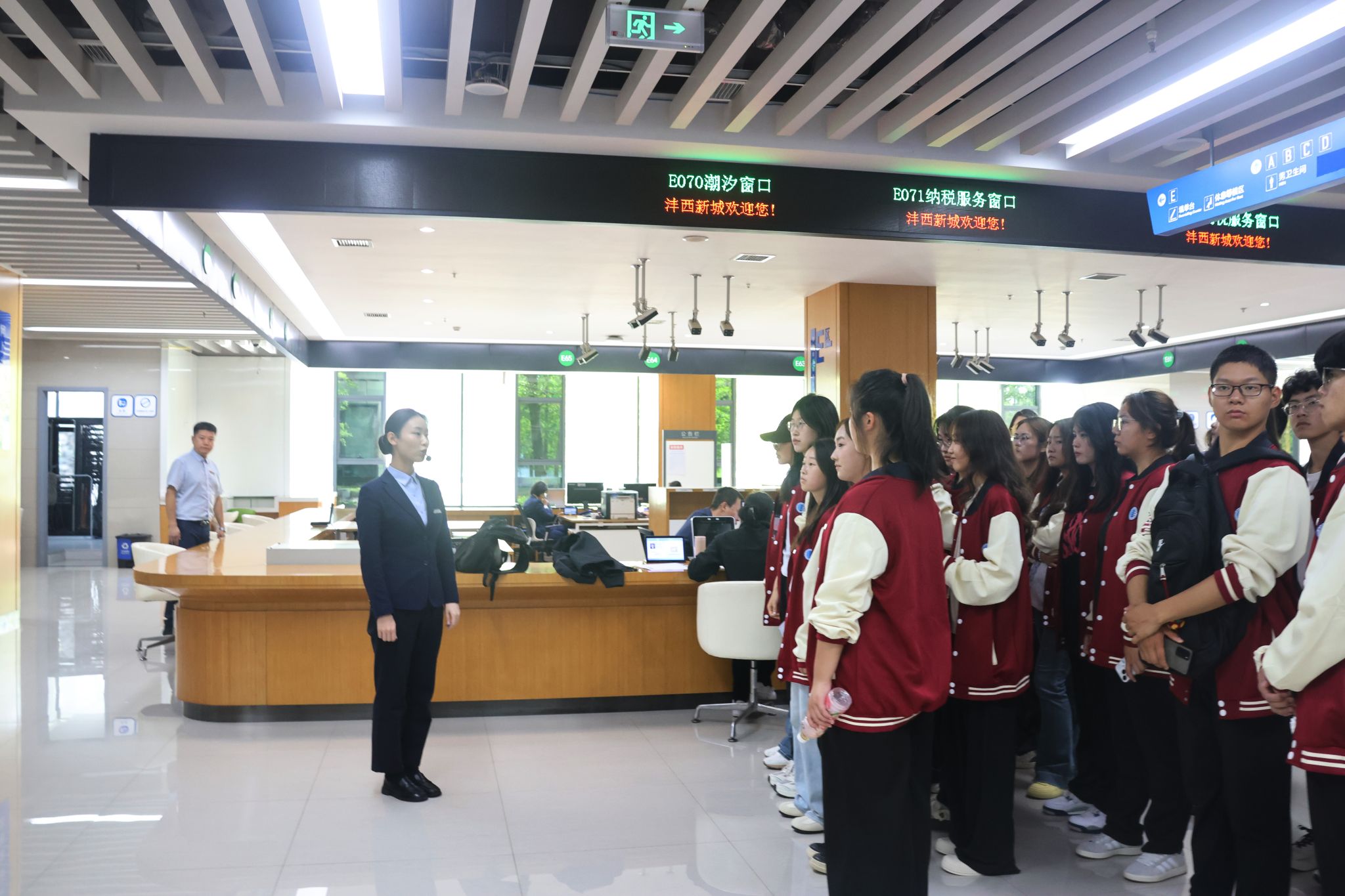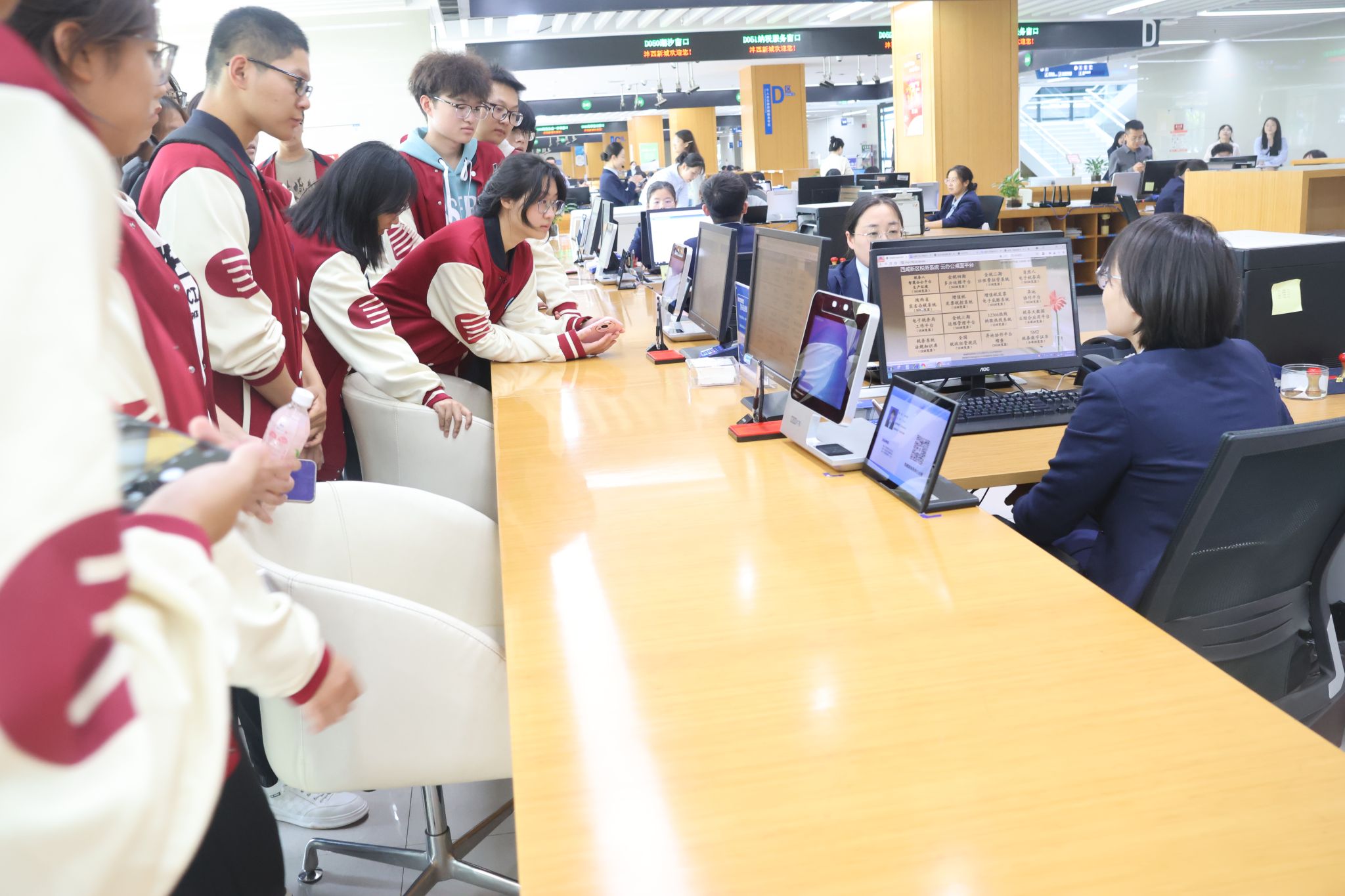 实习过程中,工作人员首先带领同学们参观了政务大厅与各业务服务部门以及涉税相关机器设备。接着从线下窗口的办税流程演示,到线上缴税平台、金税系统的操作讲解,再到各部门职能分工的细致介绍,工作人员以真实工作场景为依托,将抽象的税收工作转化为直观可感的体验,让同学们跳出课本,真切感受到税务工作的严谨性与实操性,对税务局各职能部门工作、办税终端系统、征纳互动服务建立起初步认知。