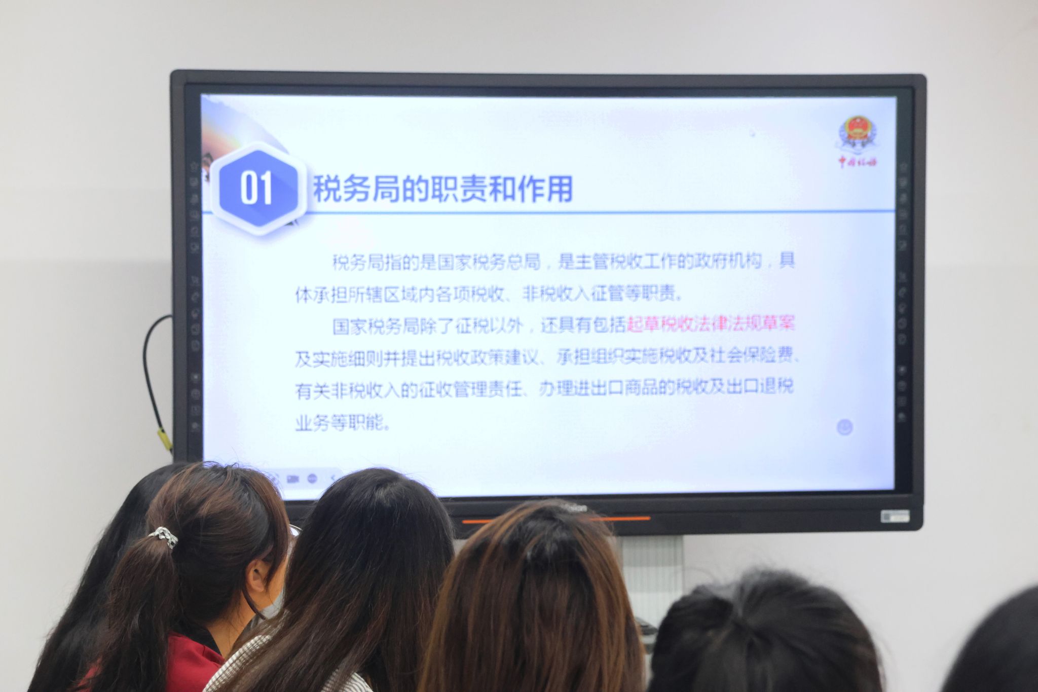 在随后的税收知识专题交流环节,工作人员围绕我国税收体系与法律规范展开讲解,重点介绍了增值税、企业所得税、个人所得税等重点税种,同时结合实际案例阐释了税务局在落实税收优惠政策、助力企业减负、促进国家现代化发展等方面的重要作用,并告诫同学们未来一定要恪守职业道德,保护国家和纳税人利益。