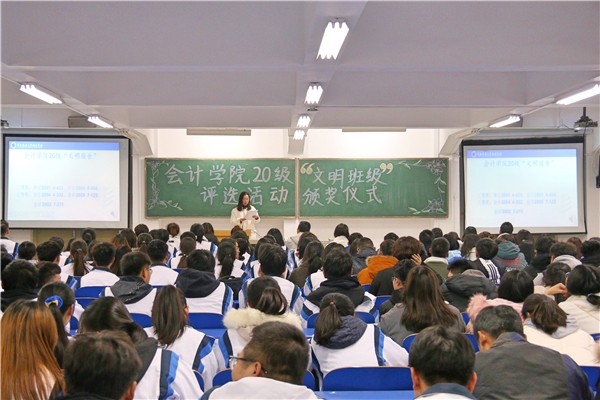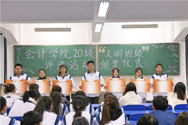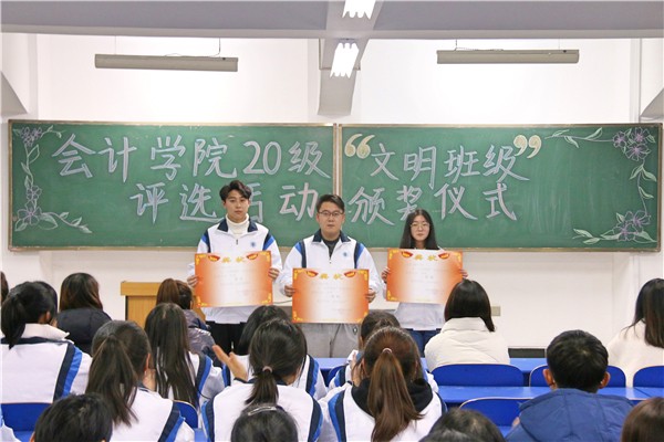 2020年12月17日晚上19时在教学楼114教室举行了“文明班级”评选活动颁奖仪式,对在此次活动中表现突出的宿舍、班级进行了表彰。一个优秀的班集体离不开每一位同学的团结付出,虽然此次评比活动已经结束,但是希望2020级的同学们依旧可以不忘初心,爱护自己的班级和宿舍,为班级宿舍文化建设贡献自己的一份力量。通过本次文明班级评比活动,进一步推进了班级文明建设,营造了良好的班级气氛,增强了同学之间的凝聚力,展现出了班级的朝气和活力。相信通过本次的班级文化建设活动,班级的文化将弥漫在班级的各个角落,班级的文明新风将融进同学们的学习生活中。