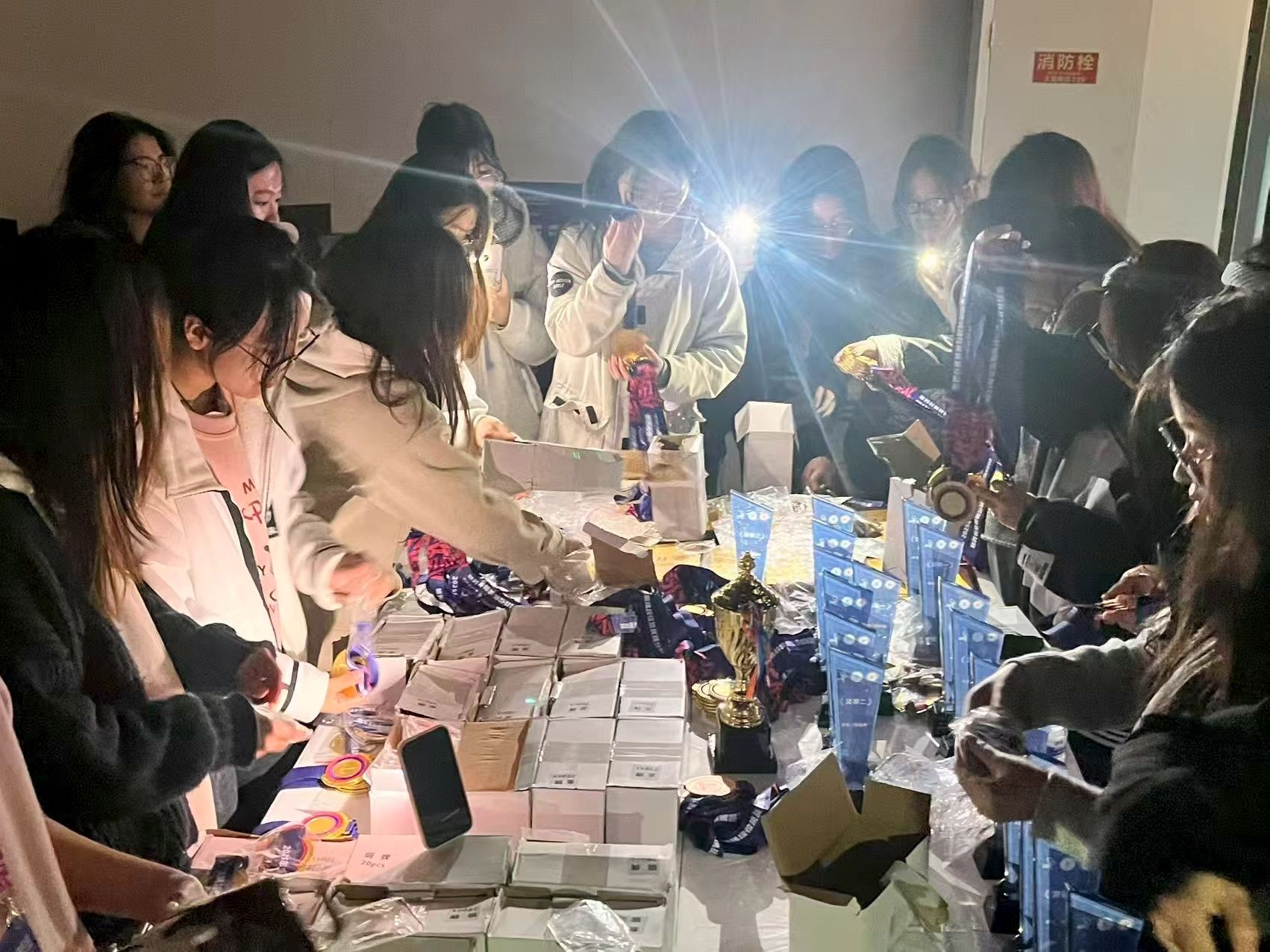 面对种类繁多的赛事物料,服务队成员分工协作,高效完成奖牌、参赛包、身份凭证等物资的清点、分装与发放,确保每一份物料准确无误地送达参赛者手中。