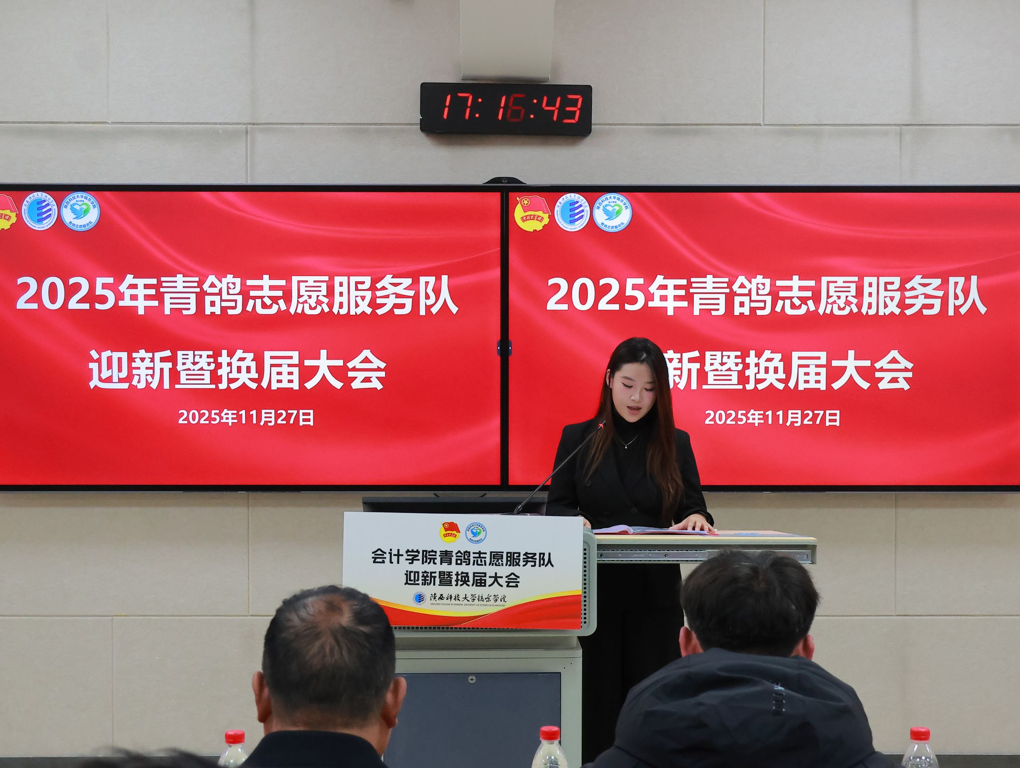 紧接着,上一届青鸽志愿服务队主席汪子越上台作2024-2025年度工作总结报告。报告全面复盘了过去一年服务队在社区服务、乡村帮扶、公益实践等领域开展的植树节绿化、清明祭英烈、特殊儿童关爱、高考助考、暑期“三下乡”等系列活动,以实际行动诠释了“奉献、友爱、互助、进步”的志愿精神。报告同时客观分析了工作中存在的不足,并对新一届服务队的发展寄予殷切期望。