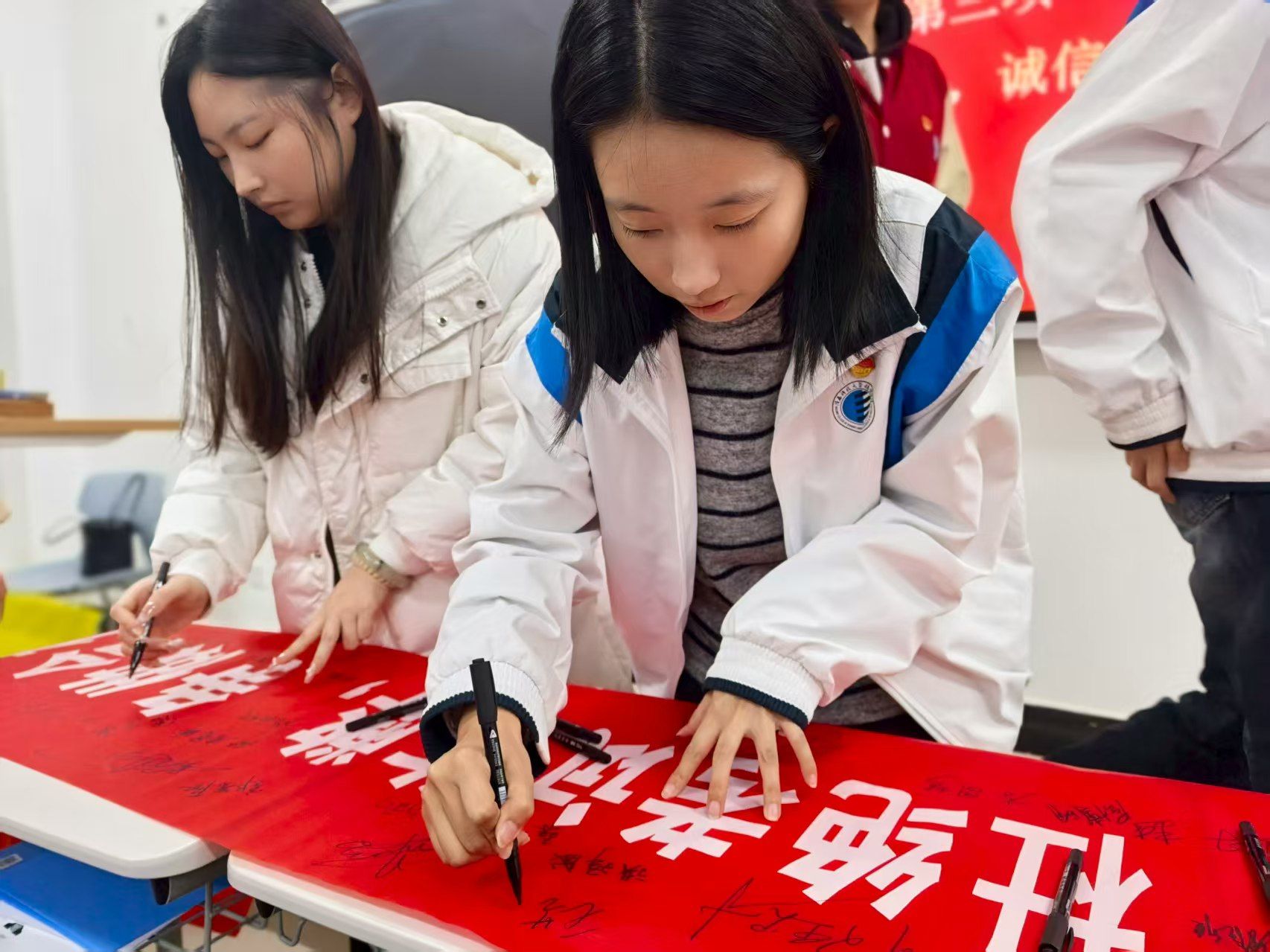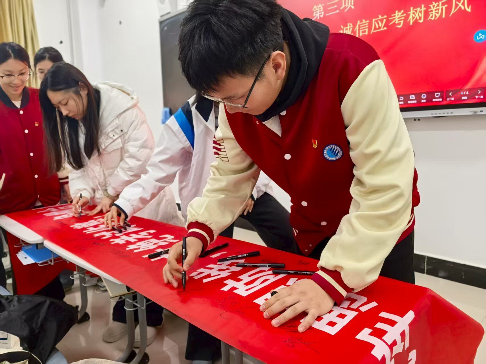 进入活动第三阶段,党支部紧扣期末考试这一关键时期,以“学习互助+诚信立心”为核心,推动党员群体实现双重提升。根据专业差异与成绩状况,党员们分成4人一组的学习互助小组,每组推选组长统筹推进工作,通过专题答疑、复习串讲、错题复盘等多样形式,为同学搭建互助提升平台。紧接着,党支部书记鲁婕宣读《党员诚信考试倡议书》,全体党员郑重签下姓名,以“筑牢思想防线,杜绝考试作弊,争做合格党员。”的铿锵承诺,诠释党员担当。现场庄重有序、热情饱满,充分展现了员工党员的先锋本色。