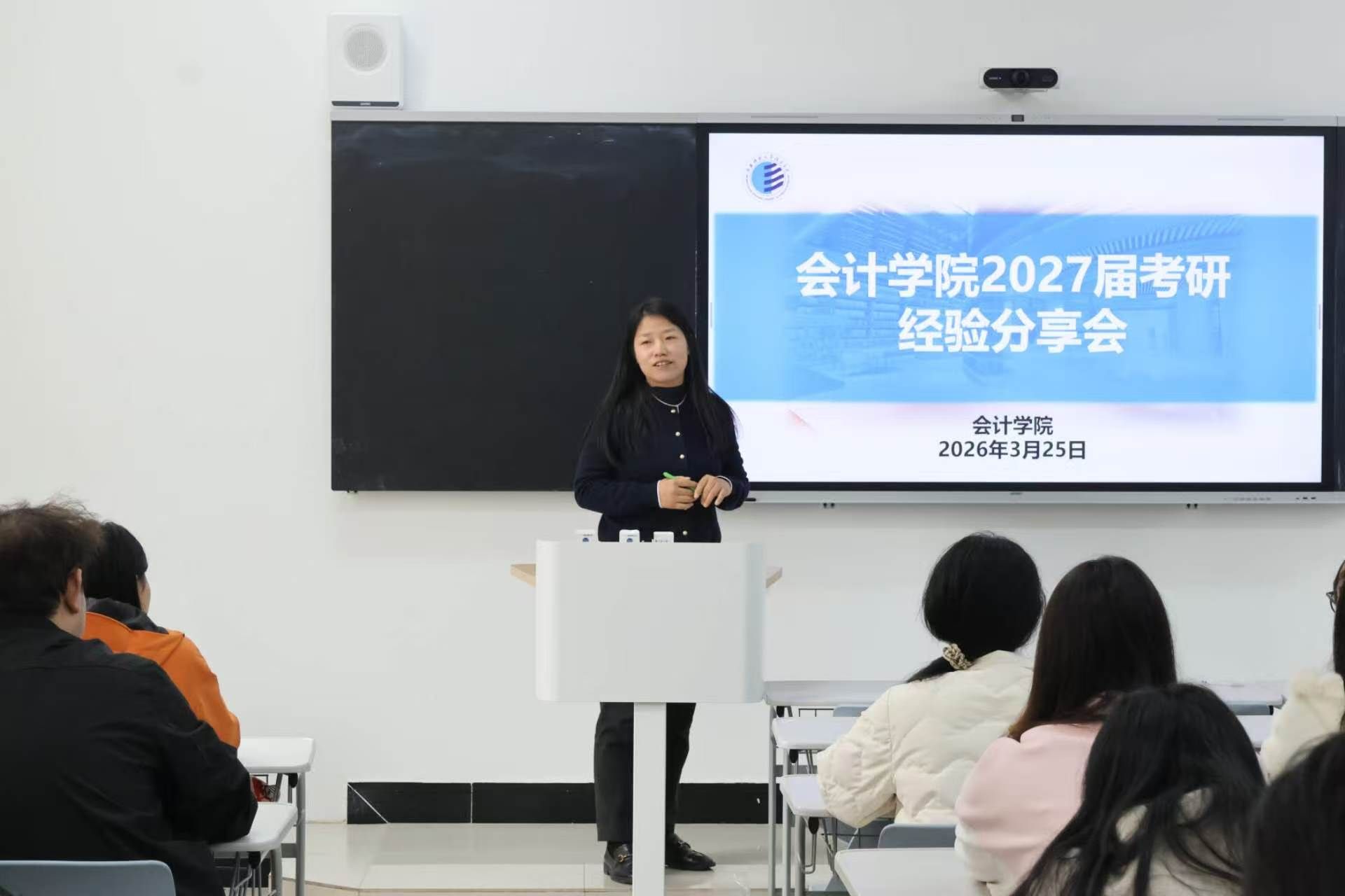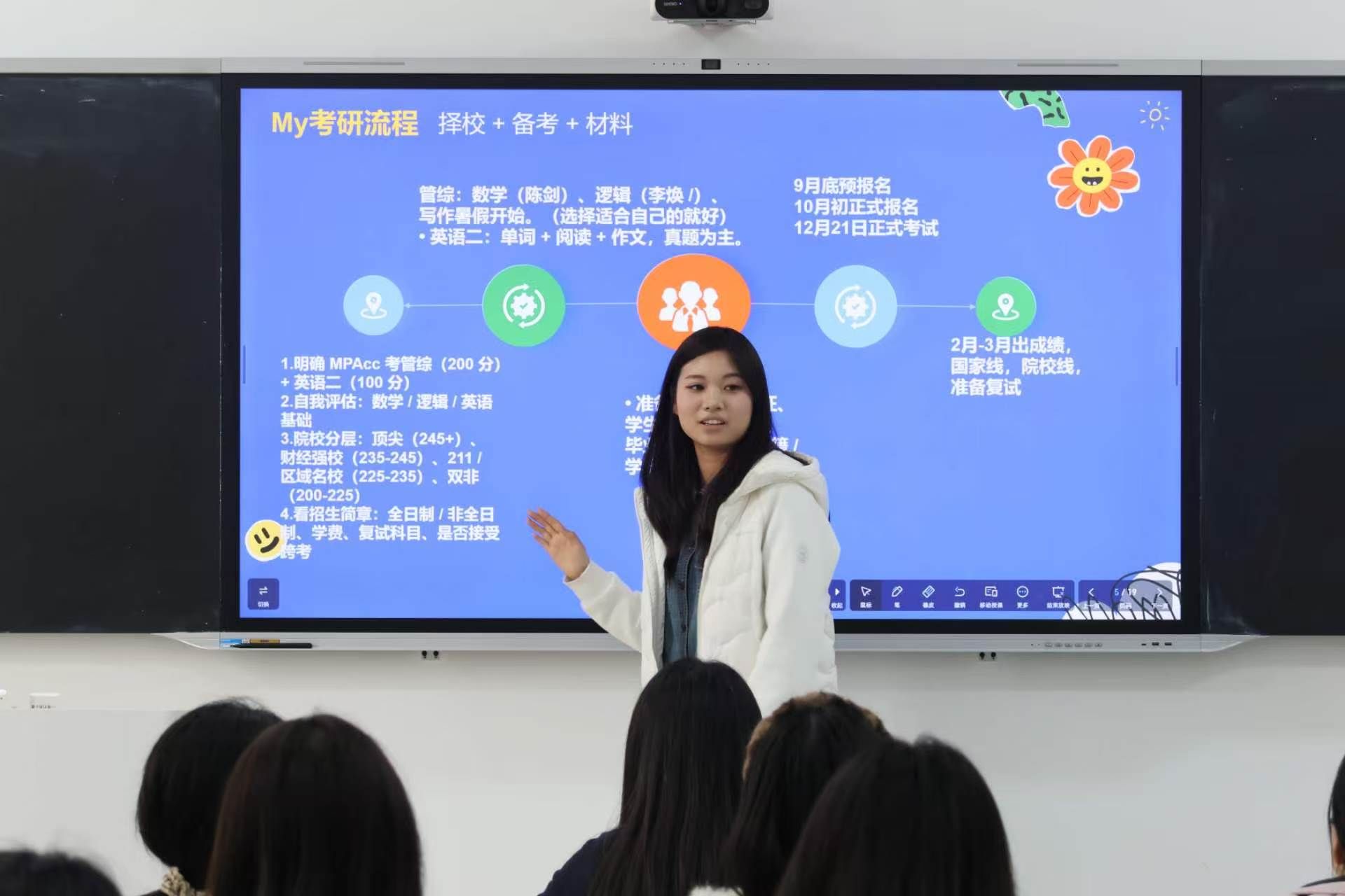 分享环节结束后,必发集团副经理韩雅轩老师作总结讲话。她对上岸学长学姐的倾囊相授表示感谢,充分肯定了他们的备考经验为学弟学妹们指明了清晰方向。结合当前会计行业发展与就业竞争形势,她强调,考研既是提升学历、深耕专业的重要途径,也是拓宽就业赛道的关键举措,备考过程中锤炼的学习与抗压能力,正是未来职场的核心素养。