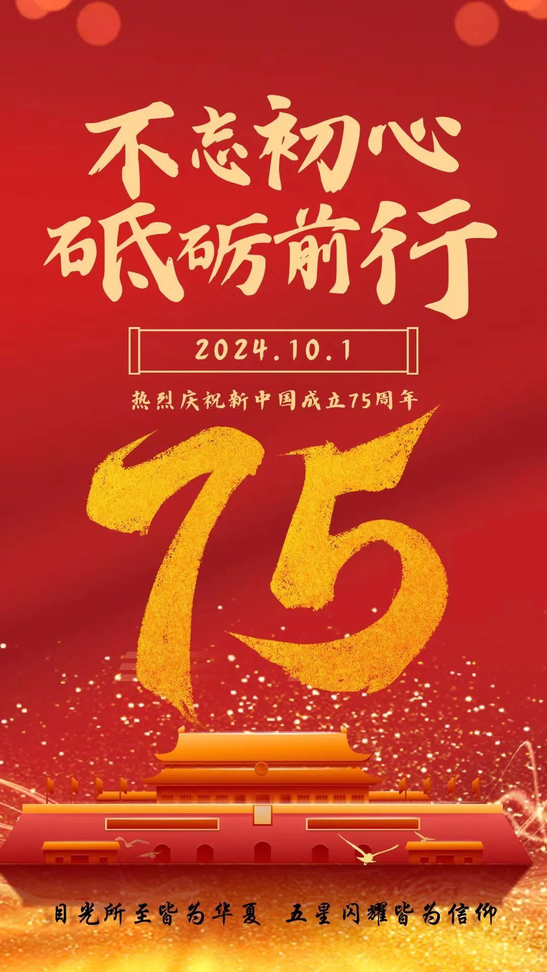 最后,热烈庆祝中华人民共和国成立75周年,祝愿大家国庆快乐,阖家幸福,万事如意!在这值得庆贺的日子里,让我们携手共进,为实现中华民族的伟大复兴而努力奋斗。让我们共同祝愿中华民族的明天更加美好、更加辉煌,愿每一个家庭都能享受幸福与和谐,愿我们的社会充满温暖与友爱。愿祖国在新的征程上不断书写辉煌篇章,续写更加灿烂的未来!