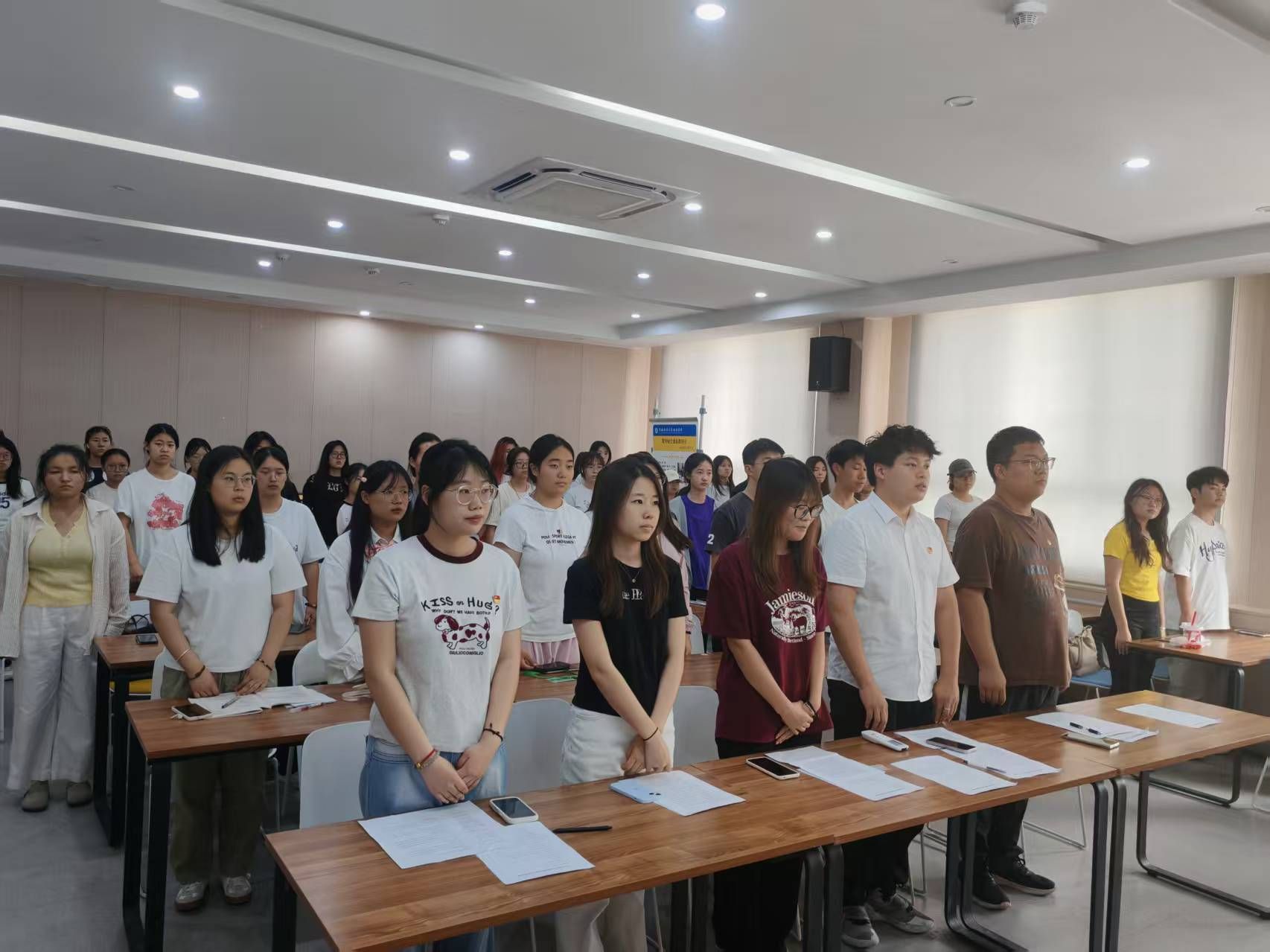 大会第一项,全体与会人员庄严肃立,激昂的旋律响起,大家齐声奏唱团歌,歌声嘹亮,现场氛围庄重而热烈。