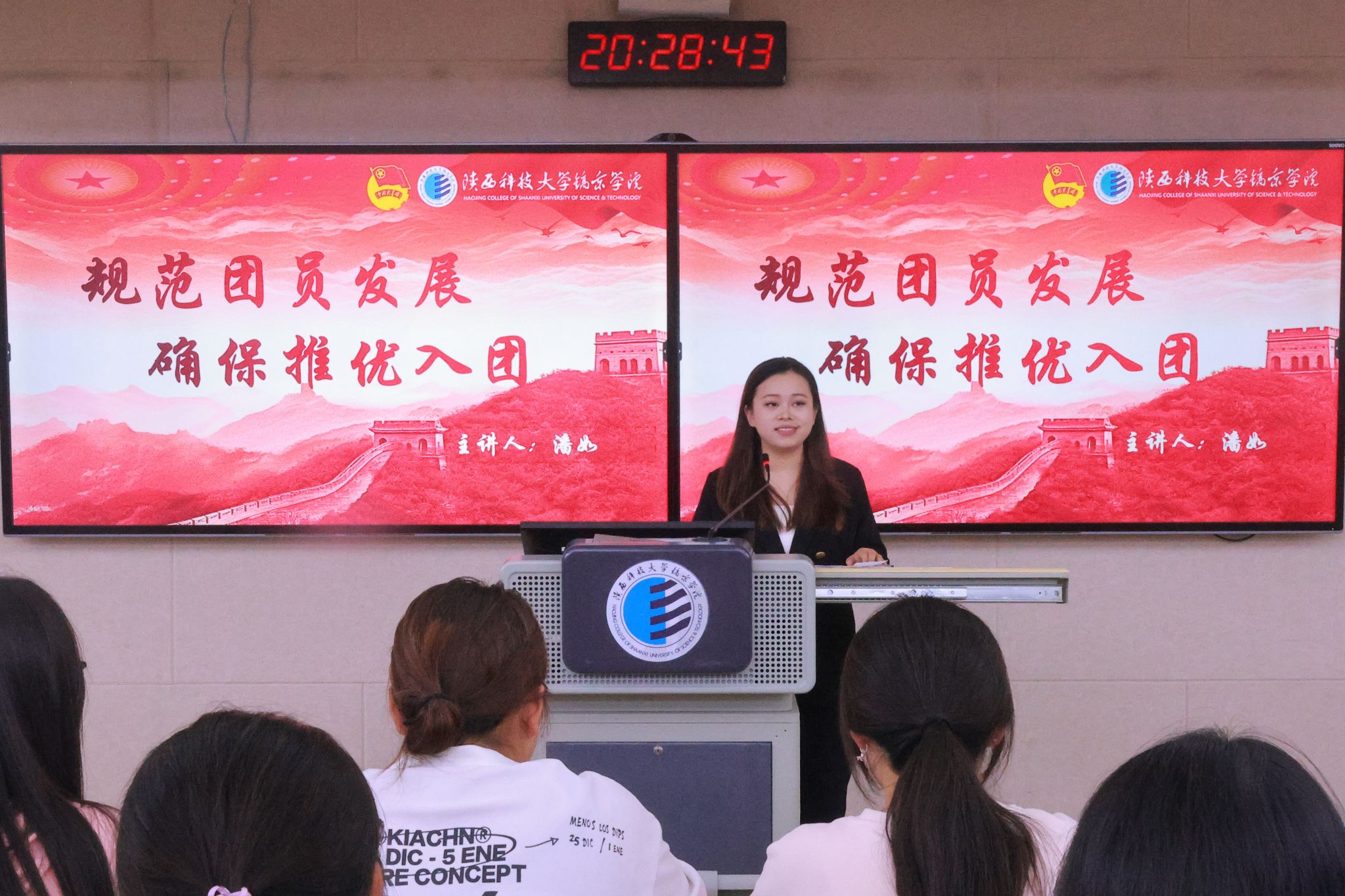 紧接着,宣讲人围绕“为什么入党、入党做什么、为党留什么”的核心问题开篇,先从思想层面引导新生们树立正确的入党动机。随后,围绕“申请-培养-考察-预备-转正”五大核心阶段,向新生系统解读入党全流程。宣讲内容聚焦各阶段的核心要求与操作规范,确保新生清晰掌握入党各环节的核心要点与时间节点。