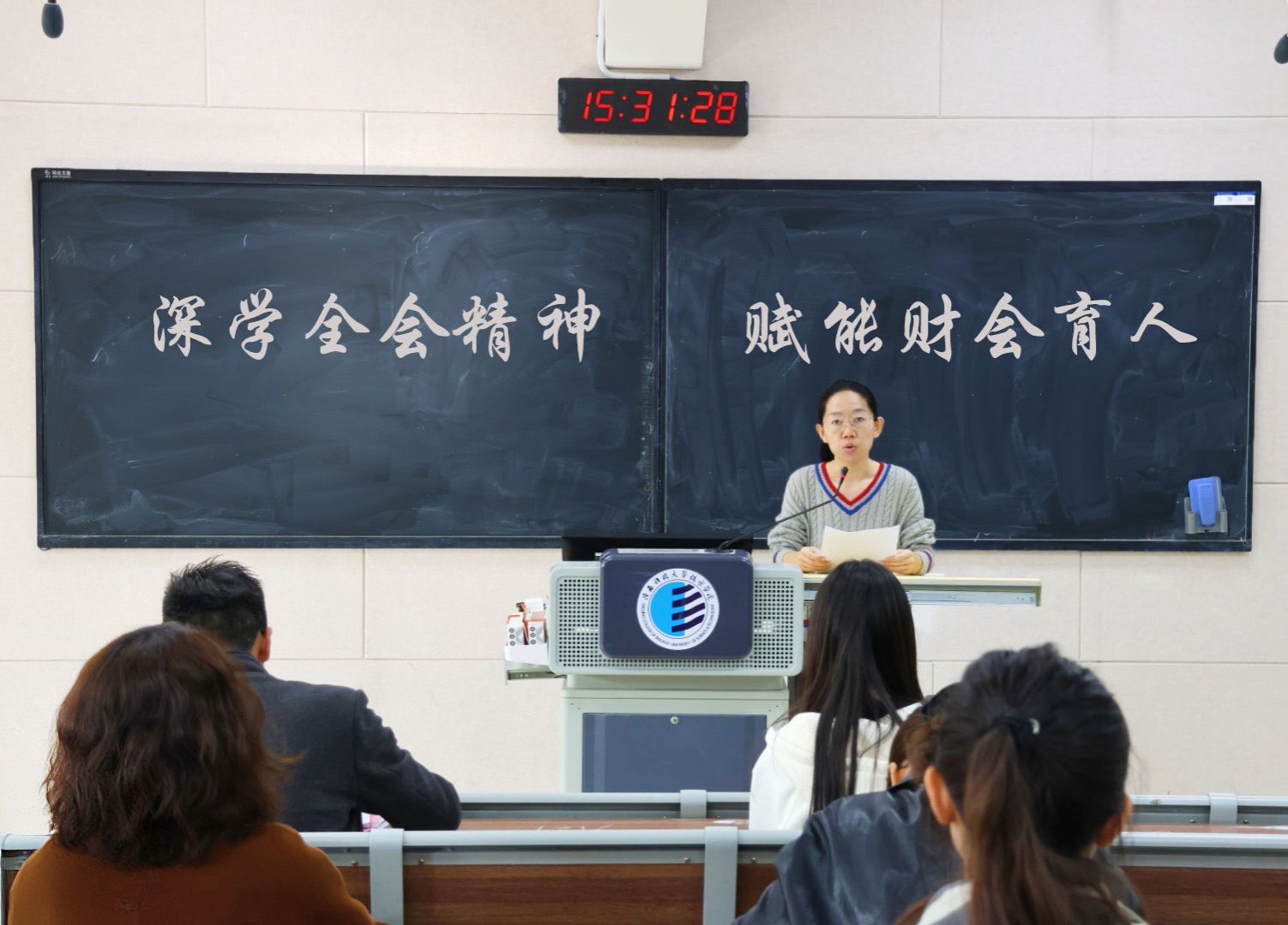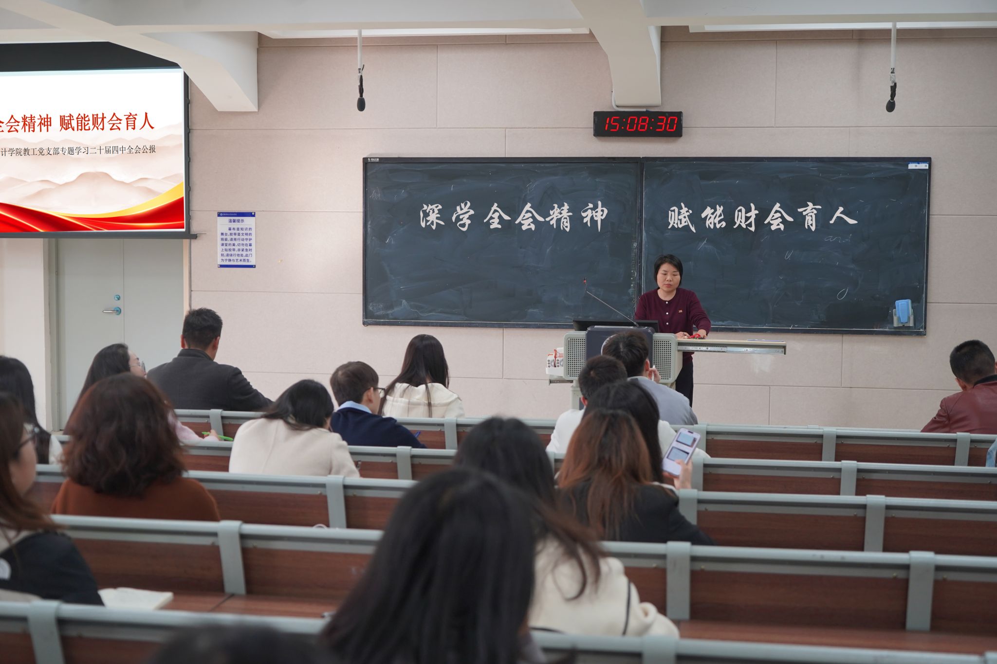 党总支书记赵卓同志总结强调,全体教工党员要以全会精神为指引,把学习成果转化为育人实效:一是深化课程思政建设,将全会精神融入专业课堂;二是聚焦财会领域前沿,推进科研创新服务高质量发展;三是强化党员先锋作用,在师德师风建设中作表率。