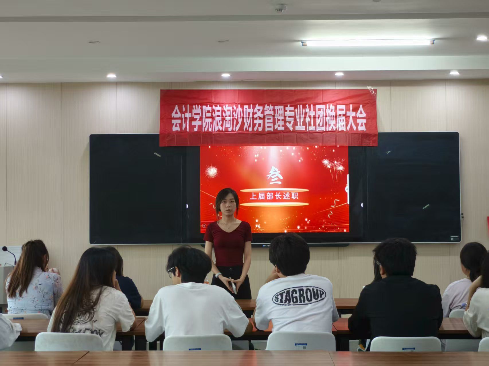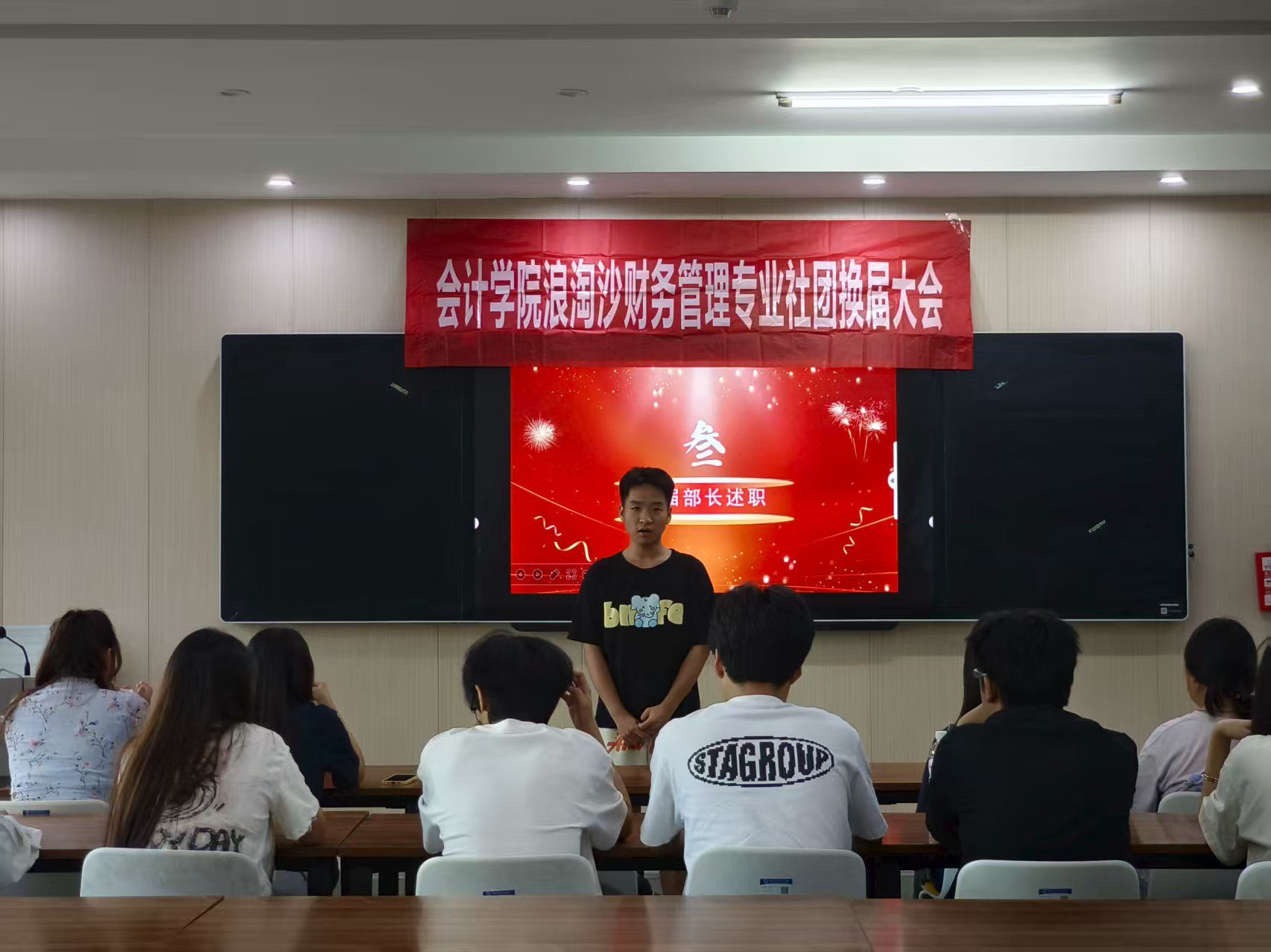 大会第二项,各部门部长接续述职,从研习部的专业研讨活动,到外联部的企业财务参访,围绕财务专业技能培养、行业资源整合,总结学年工作亮点与经验。