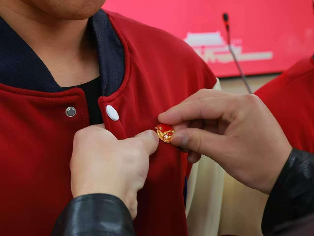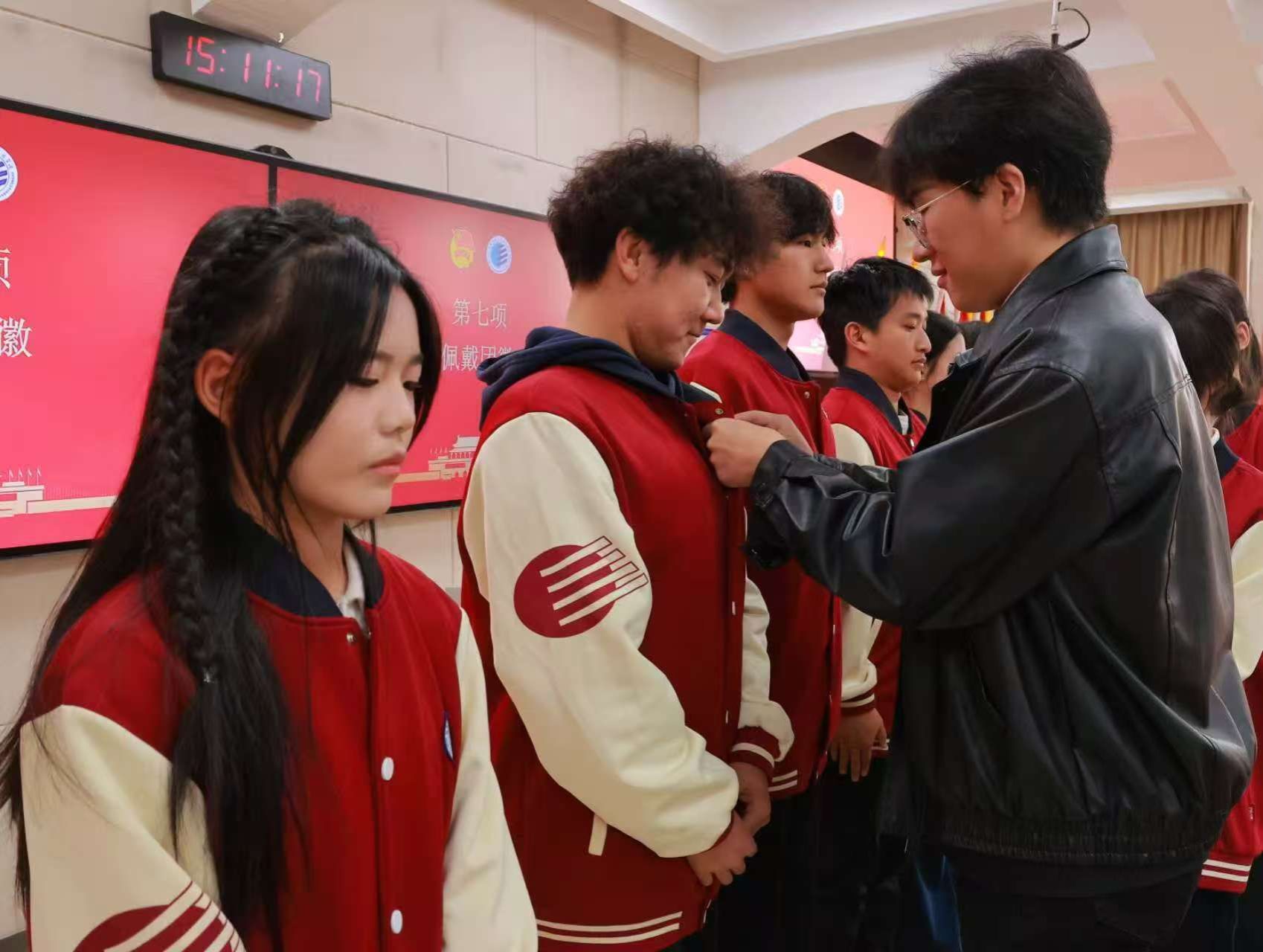 大会第七项,张瀚宇老师为新入团团员代表庄严授予团徽。这枚熠熠生辉的信仰徽章,既是政治身份的荣光见证,更是使命担当的精神火炬,它将永恒铭刻“共青团员”的政治标识,熔铸“先锋分子”的忠诚品格,引领青年学予以“先进标尺”校准奋斗坐标,让青春旗帜在学习实践中高高飘扬,用实际行动诠释新时代共青团员的先锋力量。