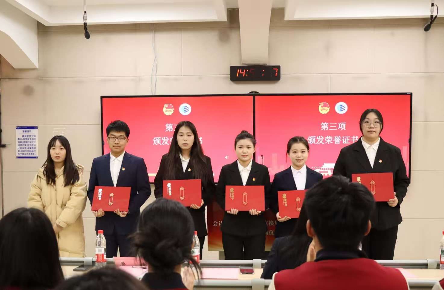 大会第三项,鲁婕老师为第三届团总支委员郑重授予功勋证书。他们以躬身实践诠释共青团“坚定不移跟党走”的初心使命,用热血青春淬炼出“政治过硬、本领高强、作风扎实”的先锋特质,不仅彰显了新时代共青团员“请党放心”的政治品格,更昭示着一代代青年骨干必将成长为民族复兴征程上擎旗奋进的中坚力量。