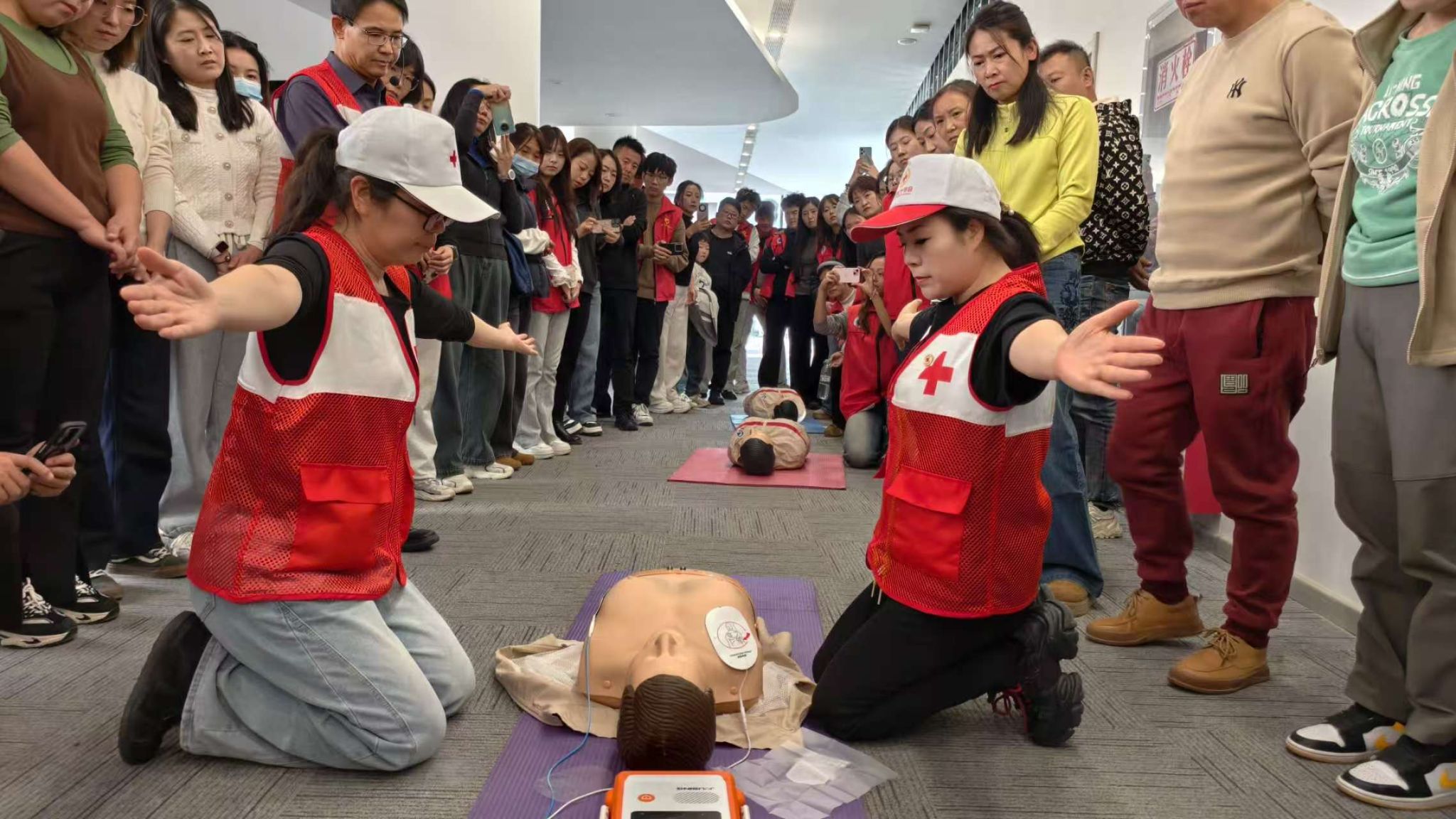 理论考核结束后,进入实操练习环节。队员们分组进行心肺复苏按压、人工呼吸及AED操作演练,讲师全程巡回指导,纠正动作细节。随后的实操考试中,队员们沉着应对,规范完成各项操作,展现出扎实的学习成果。