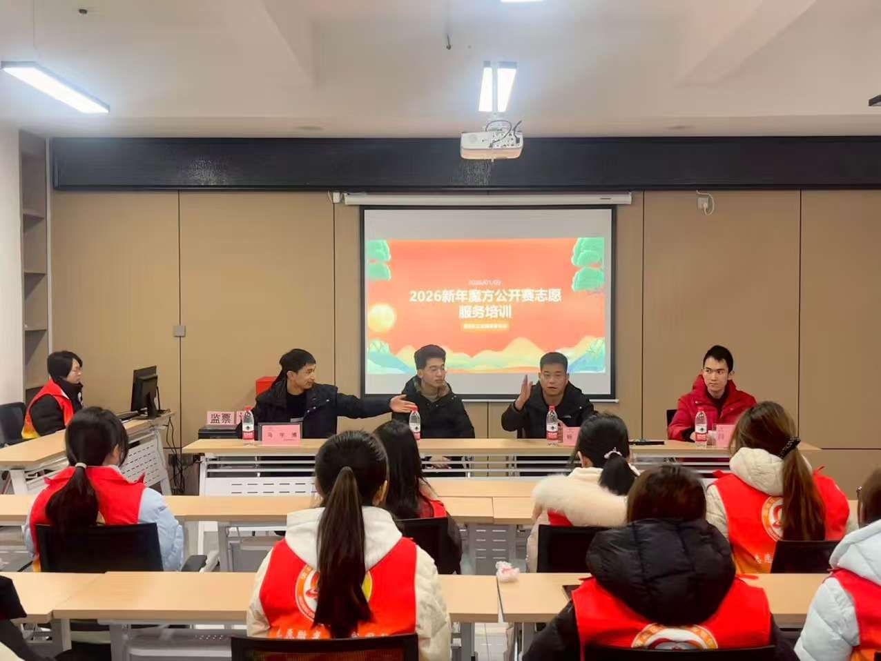为确保志愿服务工作精准高效推进,活动当天上午,全体志愿者参加了赛前专项培训。专业老师围绕魔方比赛的执裁规则展开详细讲解,重点聚焦公正计时方法、违规情形判定标准、选手成绩准确记录流程等核心内容,结合往届赛事案例拆解实操要点,为志愿者们夯实服务基础。