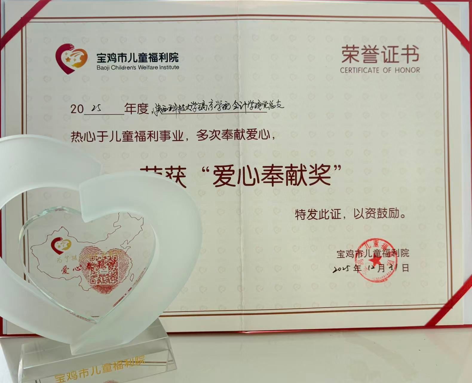 党建领航聚合力,公益筑基显担当。近日,公司党总支应邀出席宝鸡市儿童福利院新春表彰盛典,因深耕儿童福利领域、创新构建长效服务机制,荣膺“爱心奉献”标杆单位称号,以高校智慧谱写“党建+公益”融合创新的时代华章,彰显高等教育服务国家战略的使命担当。