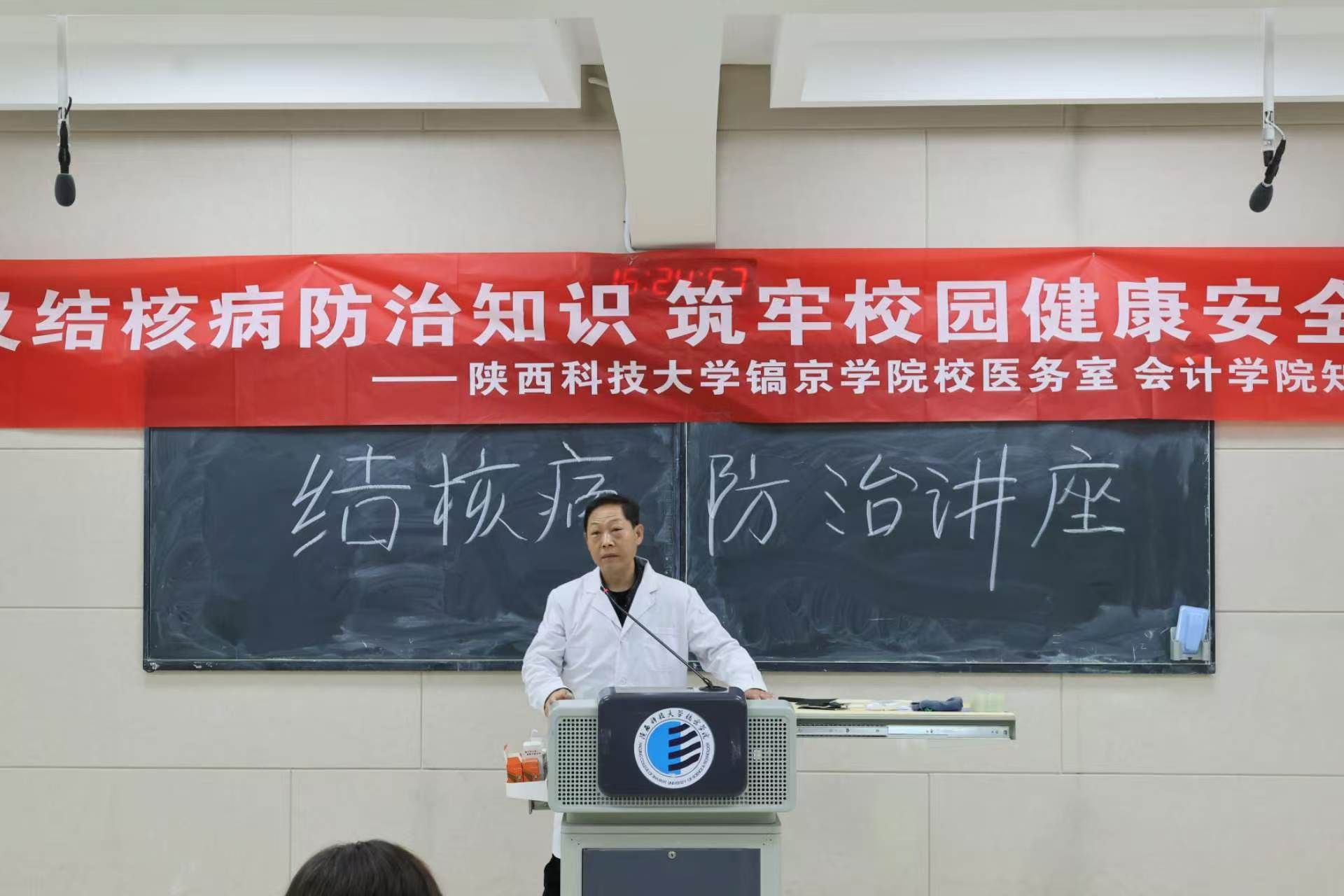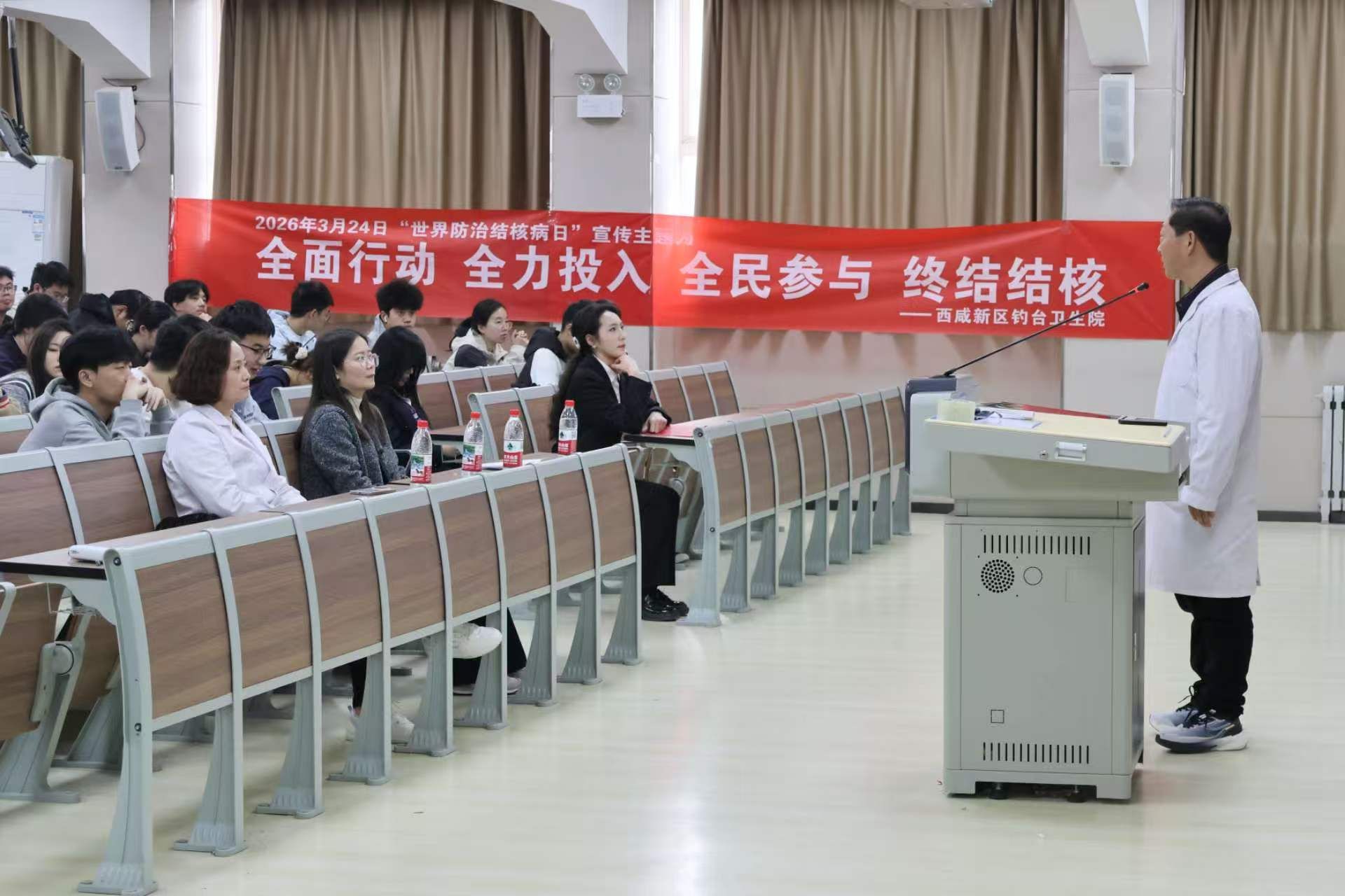 专业科普环节,西咸新区钓台卫生院刘医生结合校园实际,用通俗语言系统讲解结核病致病原理、传播途径、易感人群及日常防护要点、环境消杀、个人卫生规范等核心知识,耐心解答师生关于疫苗接种、密接排查、术后康复等疑问,破除认知误区,让防控知识真正入脑入心,夯实师生健康防护基础。