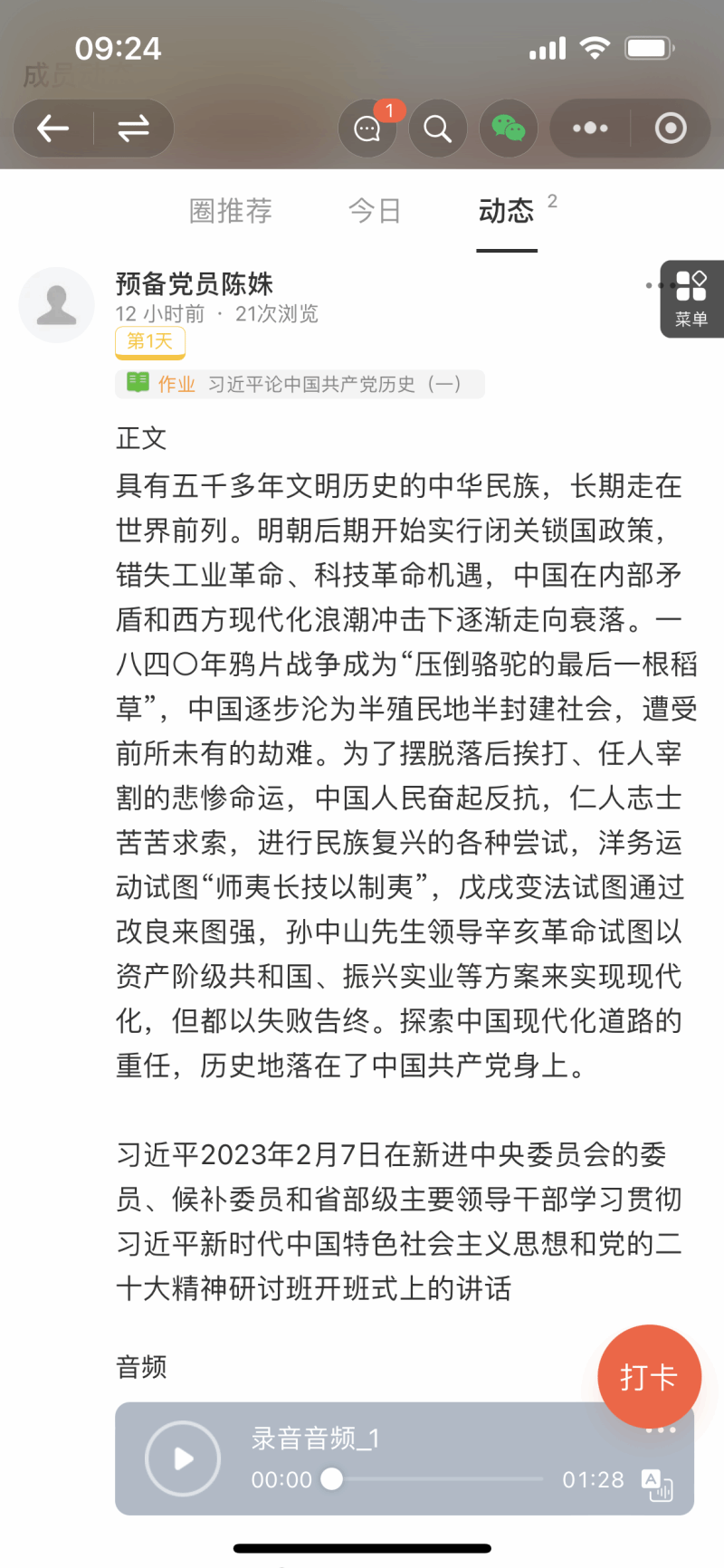 首先,薛书记向大家解读了开展党史线上打卡学习计划,让党员们了解开展党史学习教育的重大意义、目标要求和基本原则,坚持把学史明理、学史增信、学史崇德、学史力行贯穿始终,不断增强“四个意识”、坚定“四个自信”、做到“两个维护”。随后,启动“红心向党 齐读党史”线上打卡活动,通过微信小程序创建“红心向党,齐读党史”朗读学习打卡圈,号召支部党员、预备党员、发展对象、积极分子按照发布的党史知识任务进行朗读、录音并上传打卡,以及党史学习心得,并积极交流读书感悟。