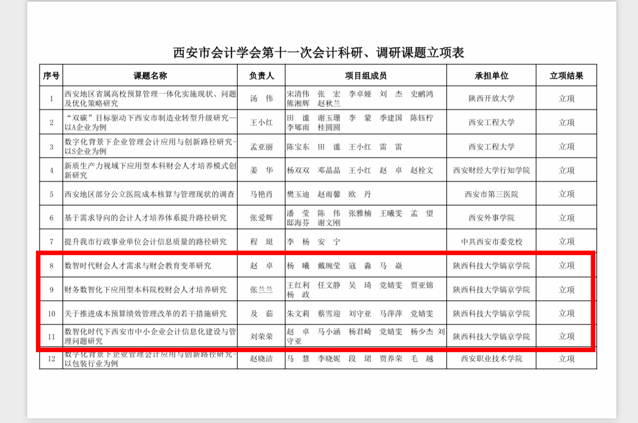 2025110日公司迎来了令人振奋的喜讯——4项课题成功获批西安市会计学会第十一次科研、调研课题立项!这不仅是对公司科研实力的充分认可,更是激励我们持续深耕会计领域的强大动力。