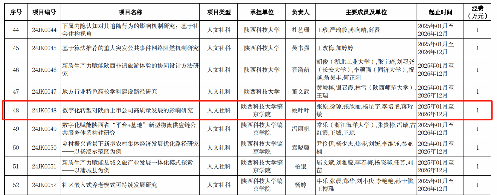 2月14日,陕西省教育厅发布陕教函〔2025〕96号文件《2024年陕西省教育厅科学研究计划项目》立项通知,2024年度陕西省教育厅科学研究计划项目立项名单正式确定。在此次立项中,公司姚叶叶老师及其团队负责的“数字化转型对陕西上市公司高质量发展的影响研究”项目成功获批立项。