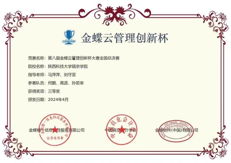 2024年4月13日,由中国商业会计学会主办,金蝶精一信息科技服务有限公司与郑州工商公司联合承办的2023(第八届)金蝶云管理创新杯大赛全国总决赛落下了帷幕。在马萍萍和刘守亚两位老师的指导下,由公司学子高波、何鹏、孙若宰组成的镐京小分队,经过激烈的比拼,最终荣获全国总决赛三等奖!