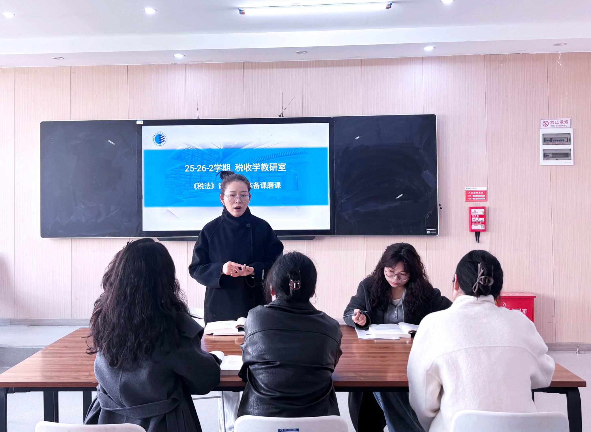 为进一步提升《税法》课程教学质量,优化课堂教学效果,明确教学思路与重难点,3月10日中午,税收学教研室于实验楼312教室开展《税法》课程专题磨课教研活动。本次活动由课程负责人张文萱老师主持,税法课程组全体教师参与研讨。活动伊始,张文萱老师结合本学期教学推进情况,对《税法》课程现阶段教学重点、授课节奏及内容衔接进行了梳理与强调,进一步统一教学思路。同时,针对课程后期考核工作,张老师与参会教师共同商议了期末出卷标准、...
